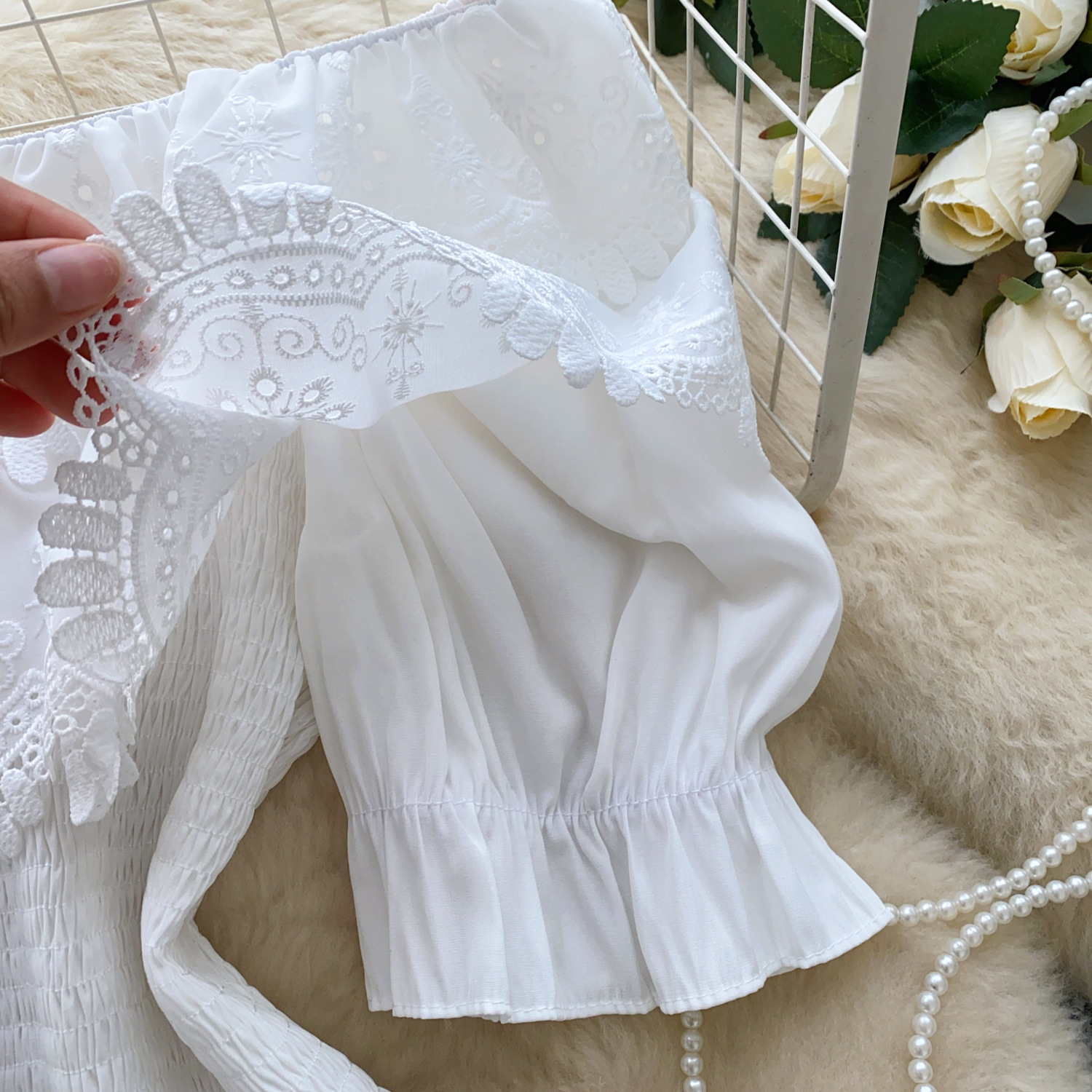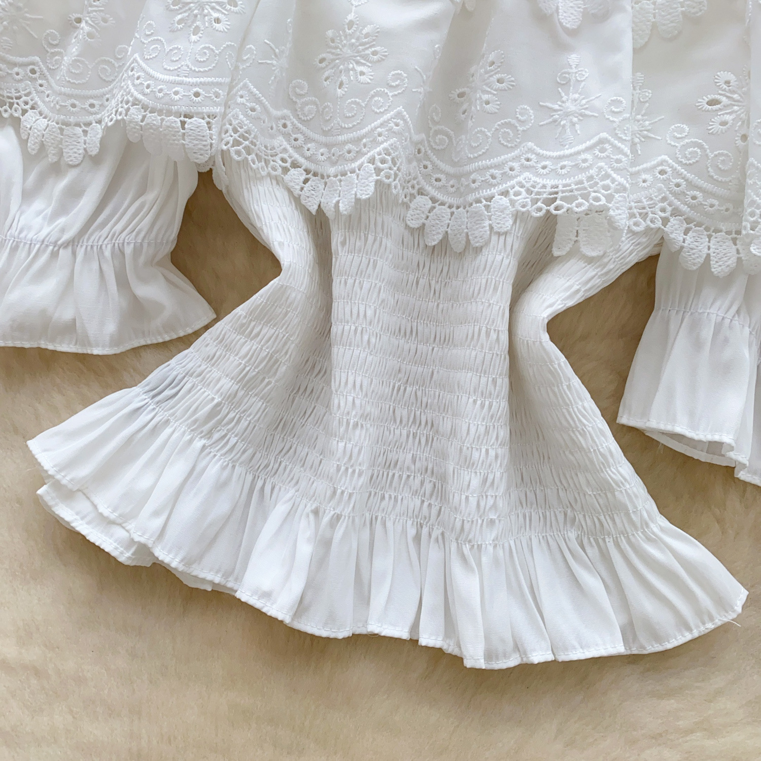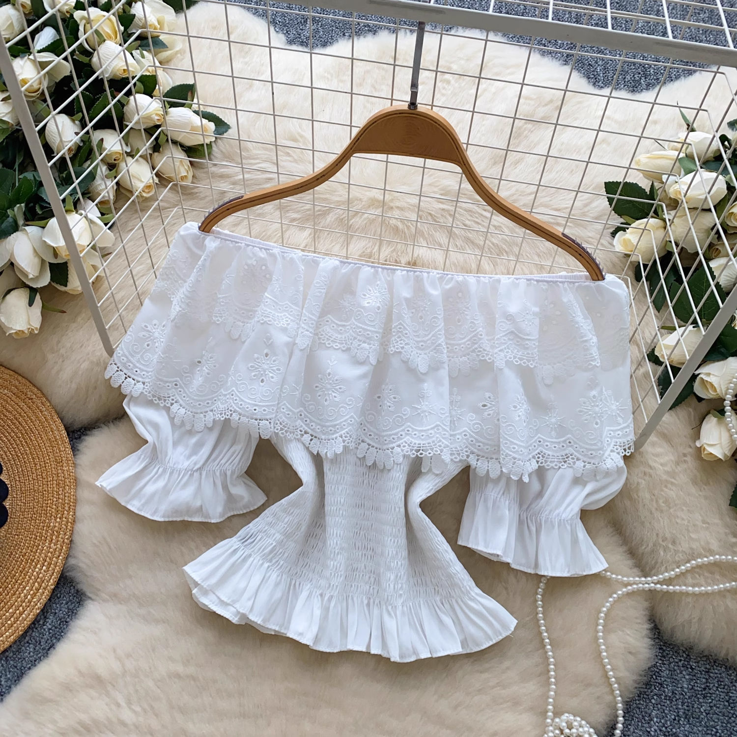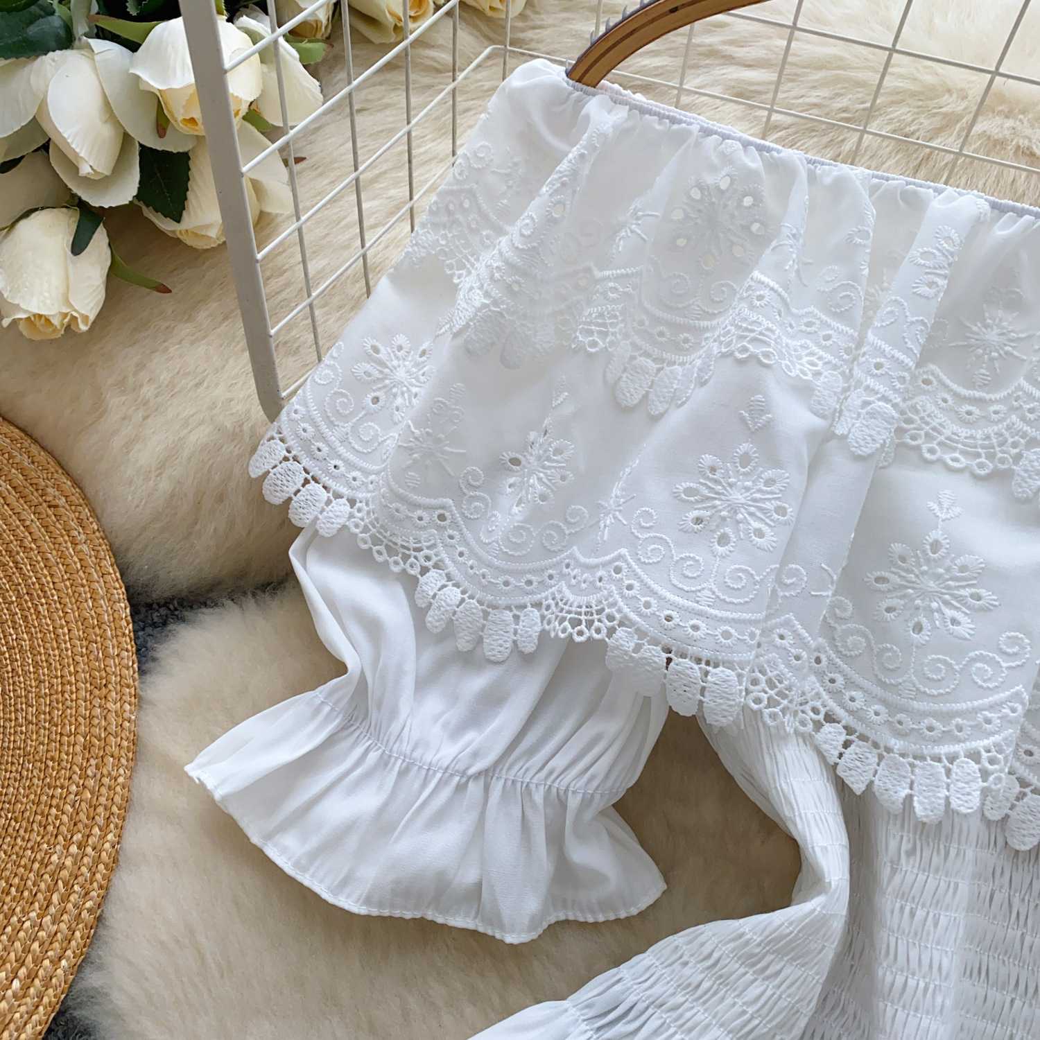 Crochet Hollowed-Out Off-the-Shoulder Puff-Sleeve Shirt For Women
