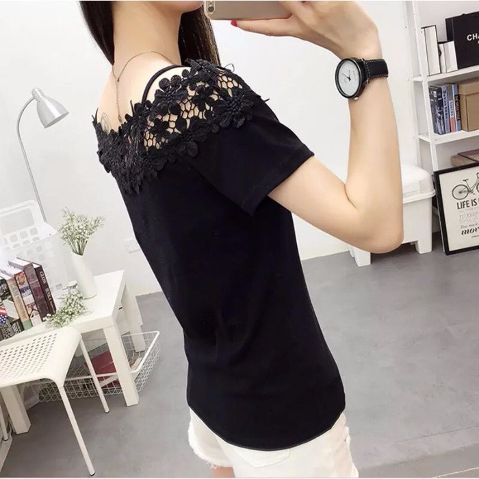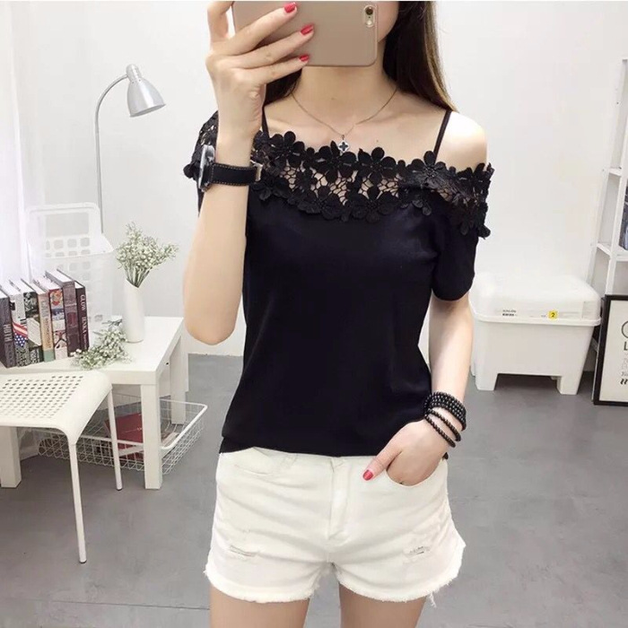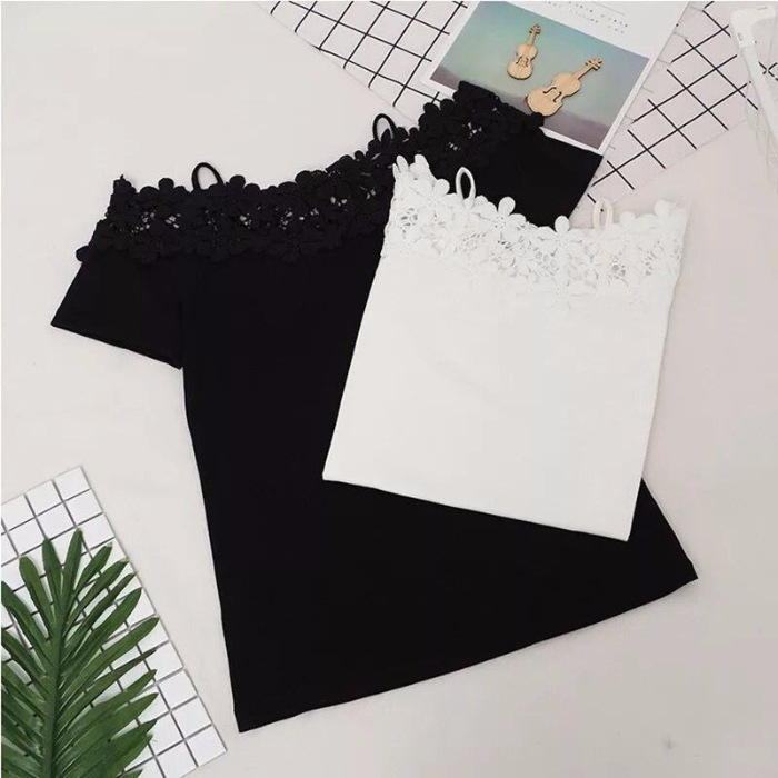 Crocheted Cutout Lace Stitching Off-the-shoulder Off-neck Short Sleeve T-shirt