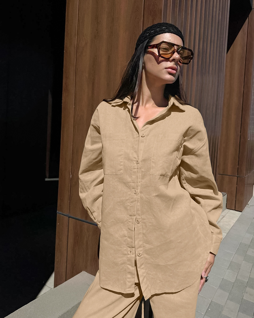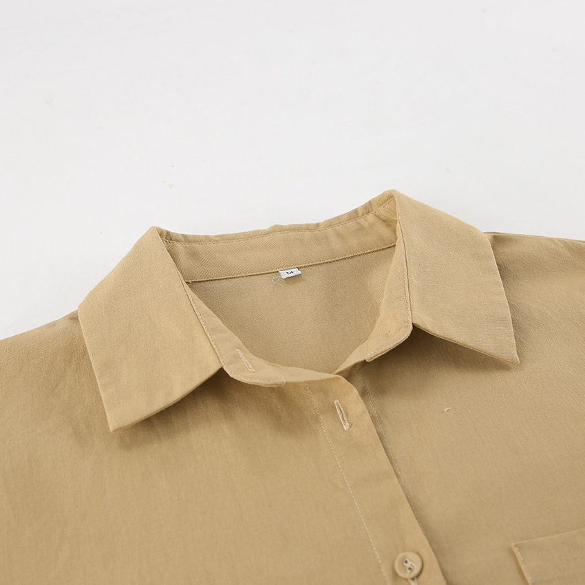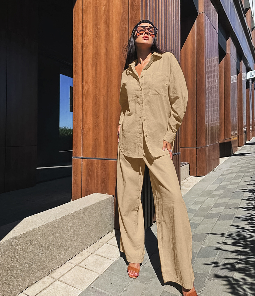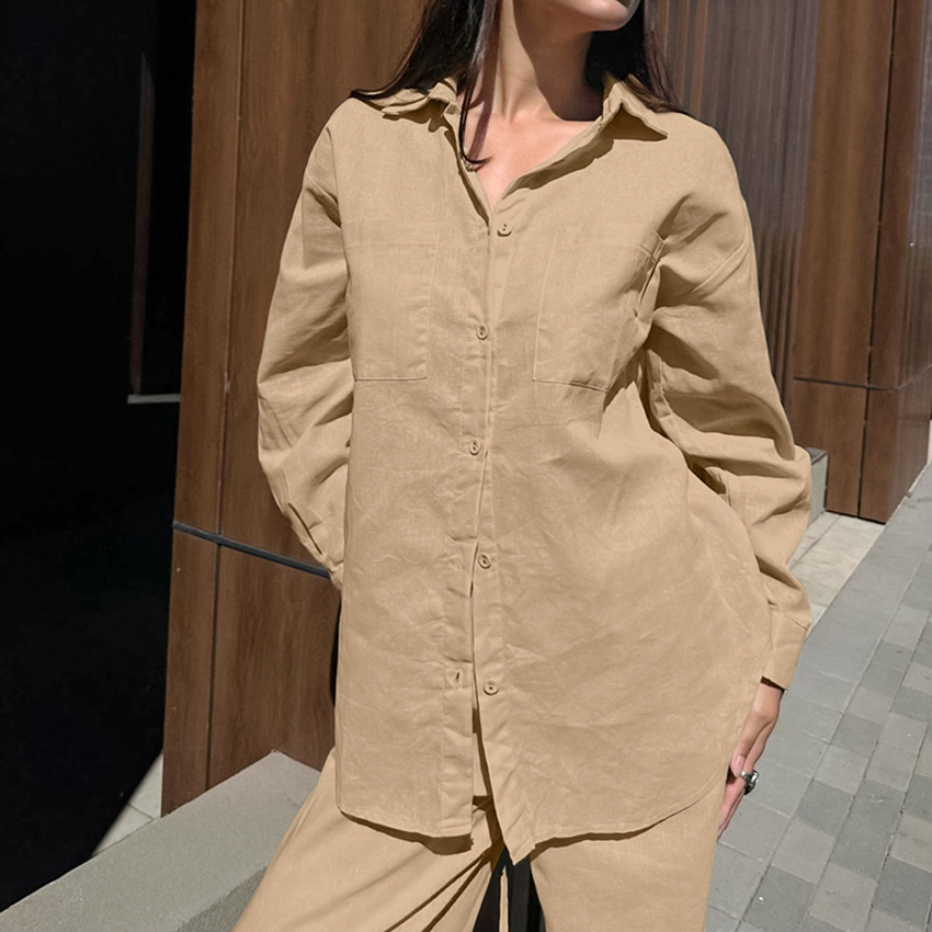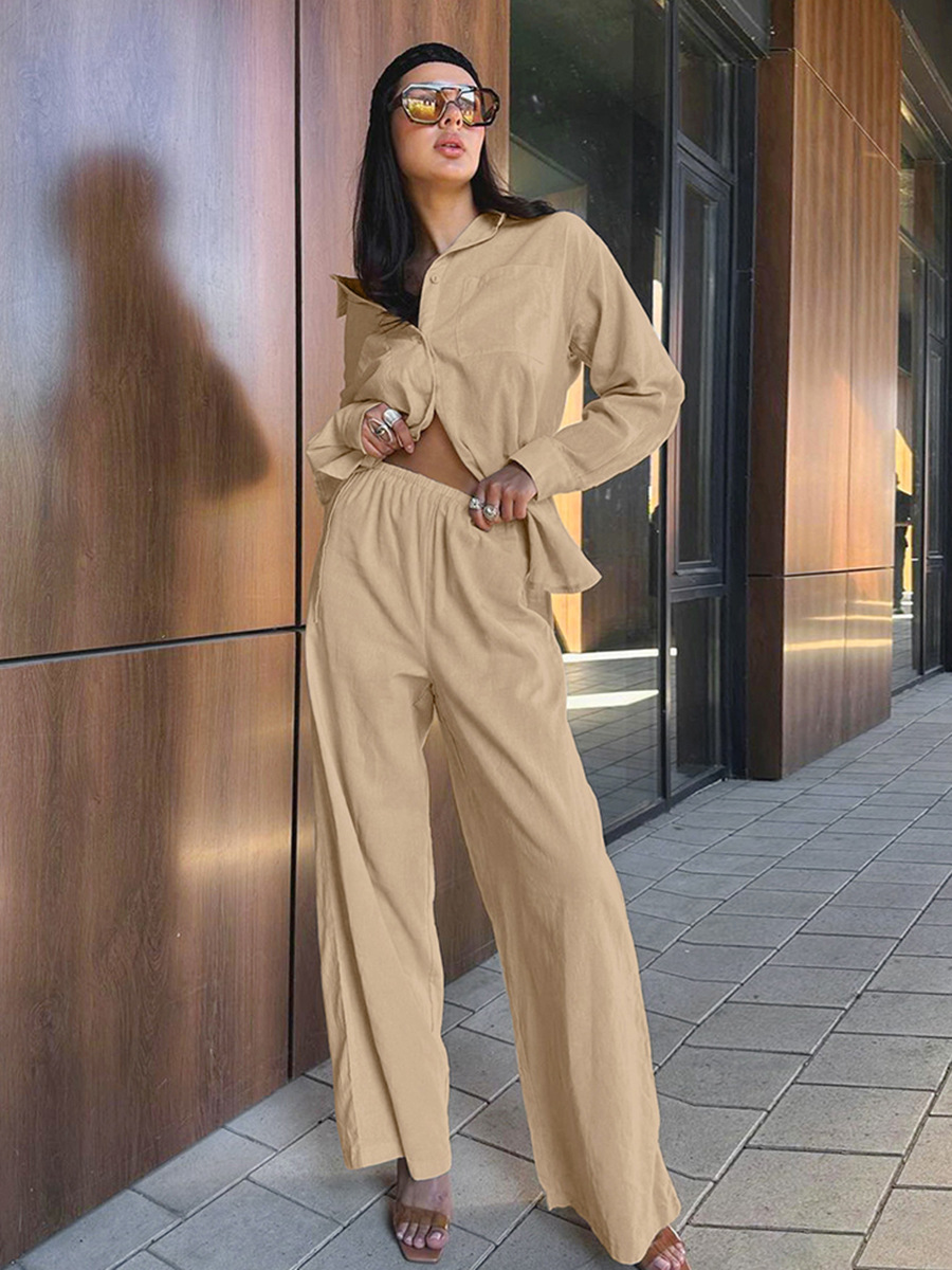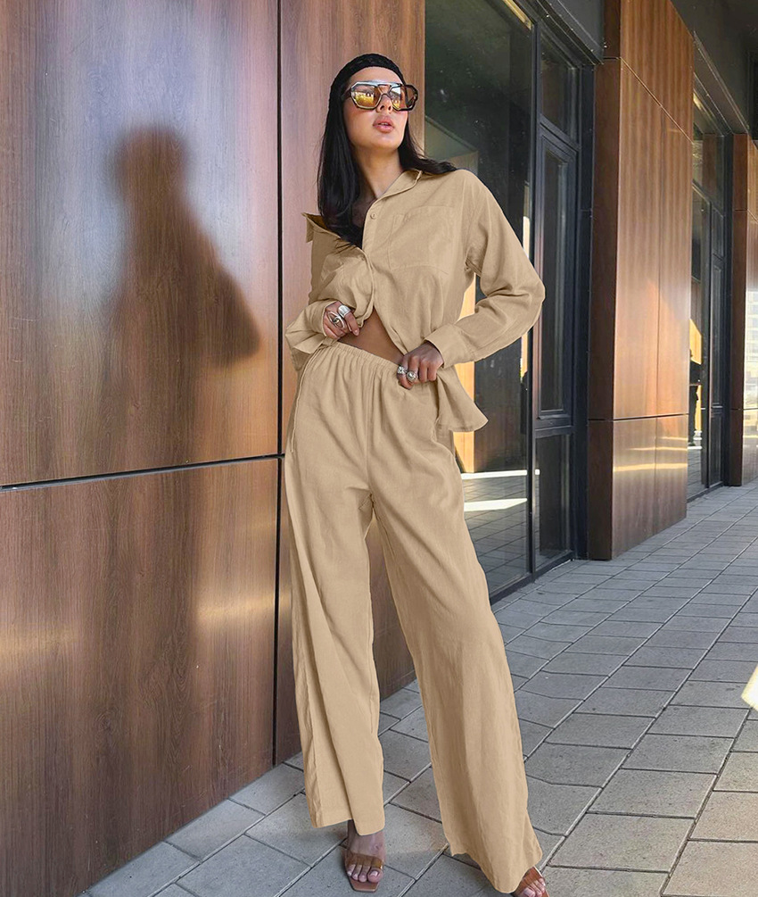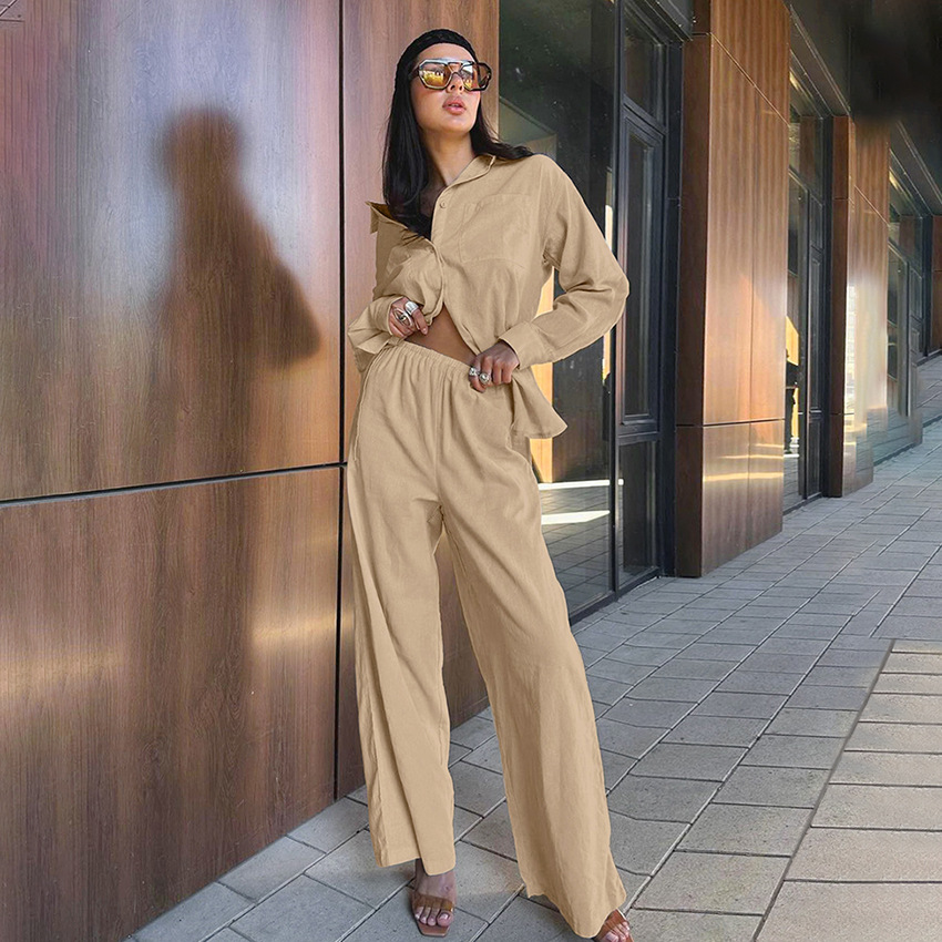 Cross-border Casual Khaki Cotton-linen Set Autumn Foreign Trade Shirt Wide-leg Pants Two-piece Street Style Women's Clothing