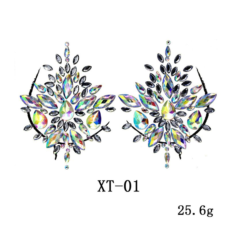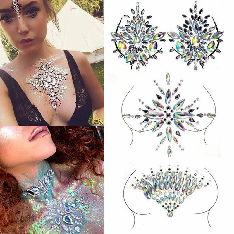 Product Name: Rhinestone Chest StickerMaterial: resin drillThere is glue on the back of the product that can be directly attached.