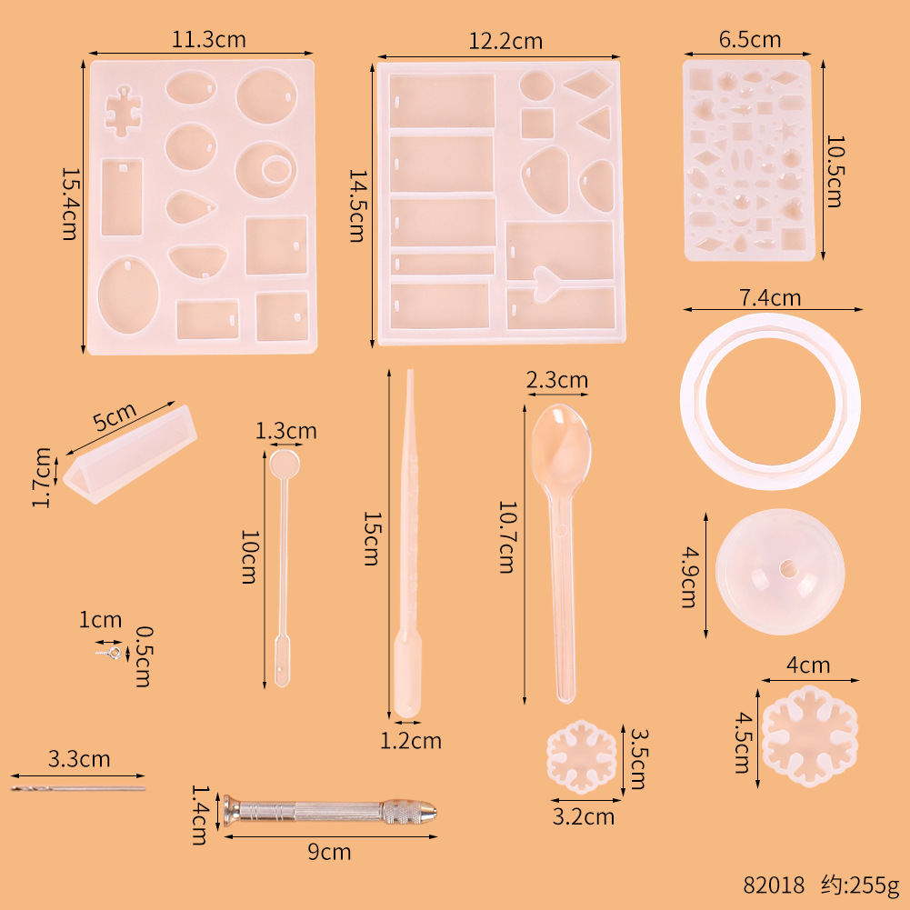 12 glue drop moulds, 5 spoons, 5 stirring rods, 5 droppers, a handle, (50 gold and silver croissants each), 10 drill bit