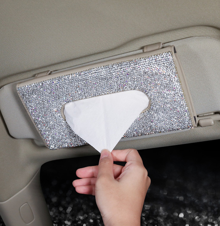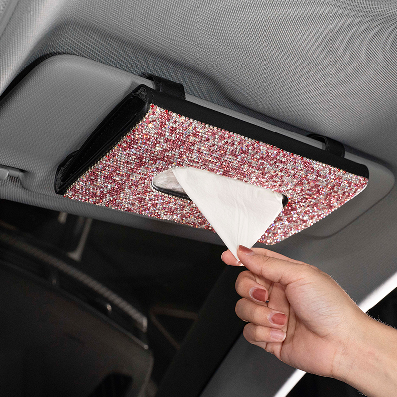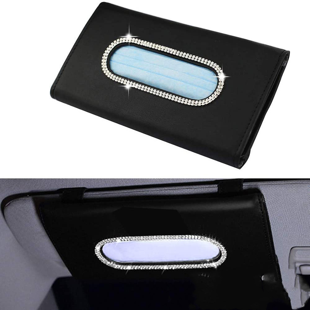 Hot Sale Bling Crystal PU Leather Universal Hanging Style Sun Visor Car Tissue Box