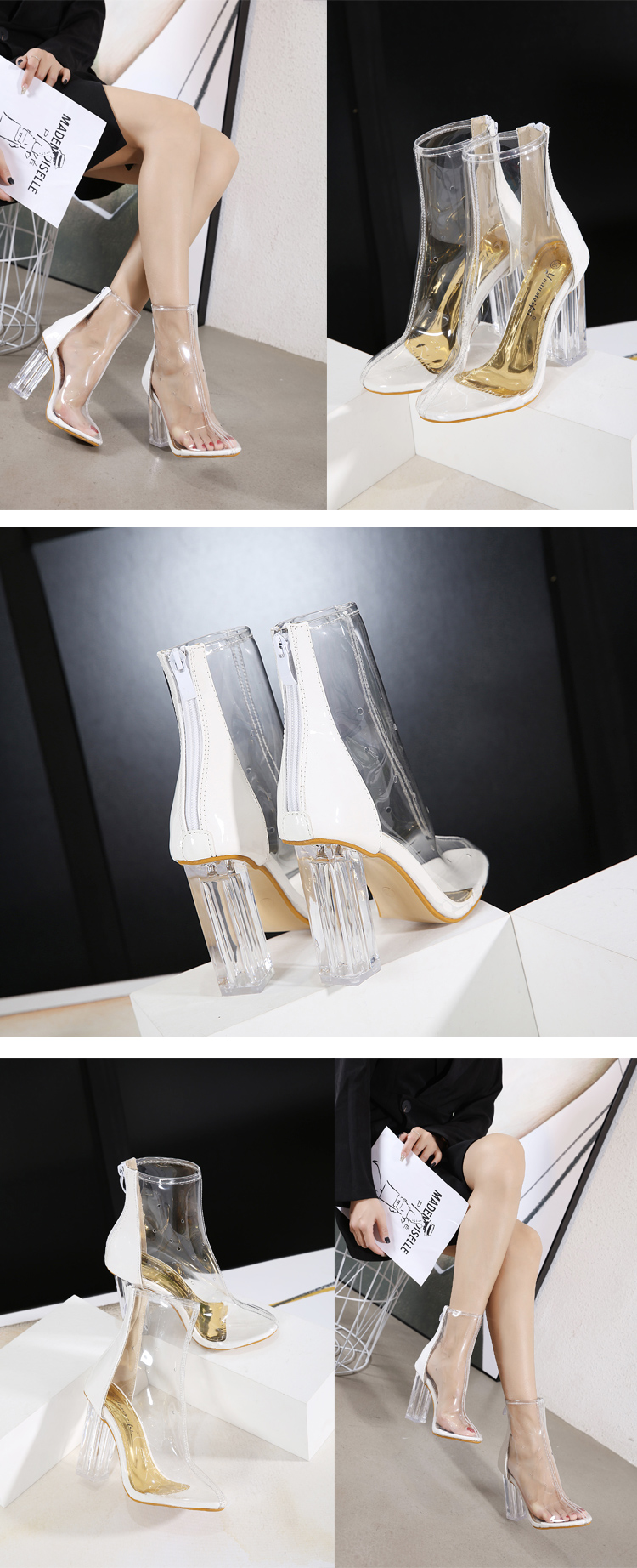 Crystal Thick Heel Transparent Plastic Color Matching High Heel Pointed Toe Women's Sandal Boots