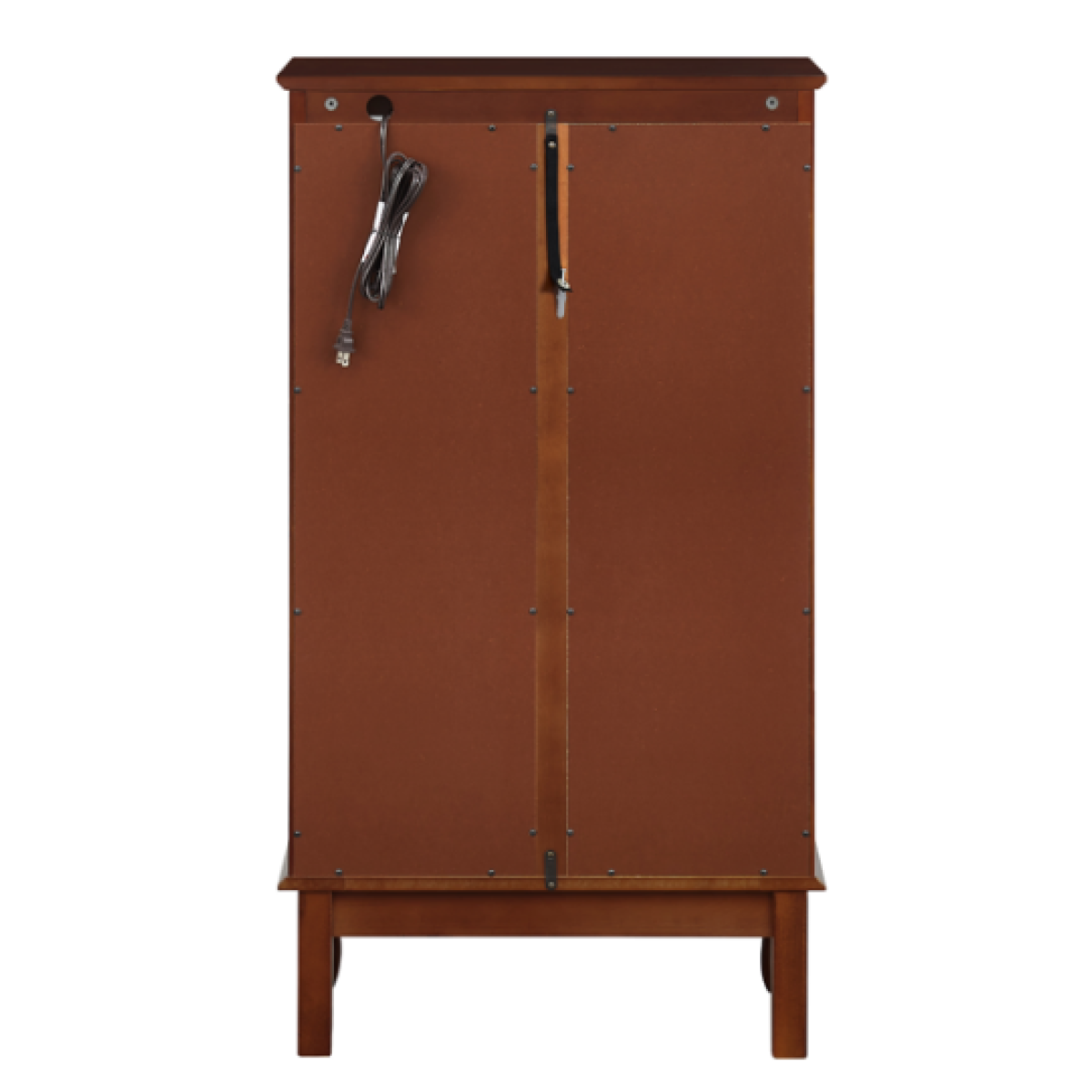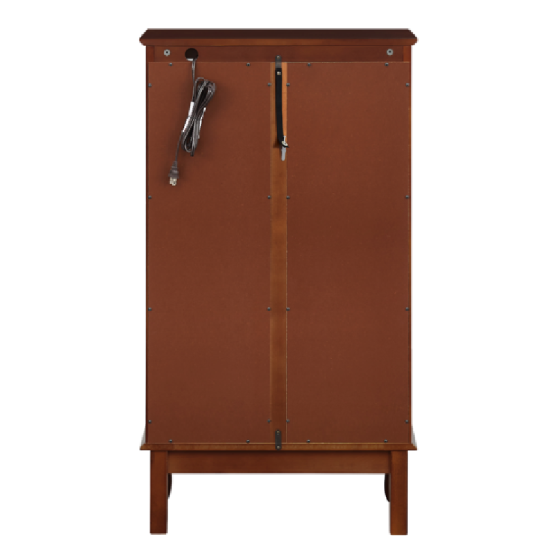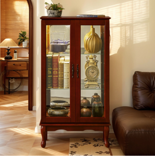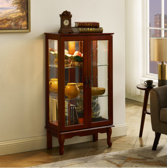 Color: Cherry Material: Solid and composite wood Product Dimensions:43.5"H x 11.75"D x 26"W Mounting Type: Floor Mount Style: Classic Door Style: Mirrored Number of Doors: 2 Shape: Rectangular Number of Shelves: 3 Number of Pieces: 1 Product Care Instructions: Wipe clean with a dry cloth, Do not use strong liquid cleaners. Item Weight: 49.28 Pounds Load Capacity: 100 Pounds Assembly Required: Yes