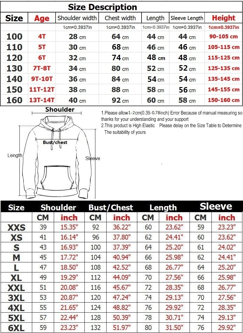 Size: XXS, XS, S, M, L, XL, XXL, 3XL, 4XL, 5XL, 6XL, 100, 110, 120, 130, 140, 150, 160