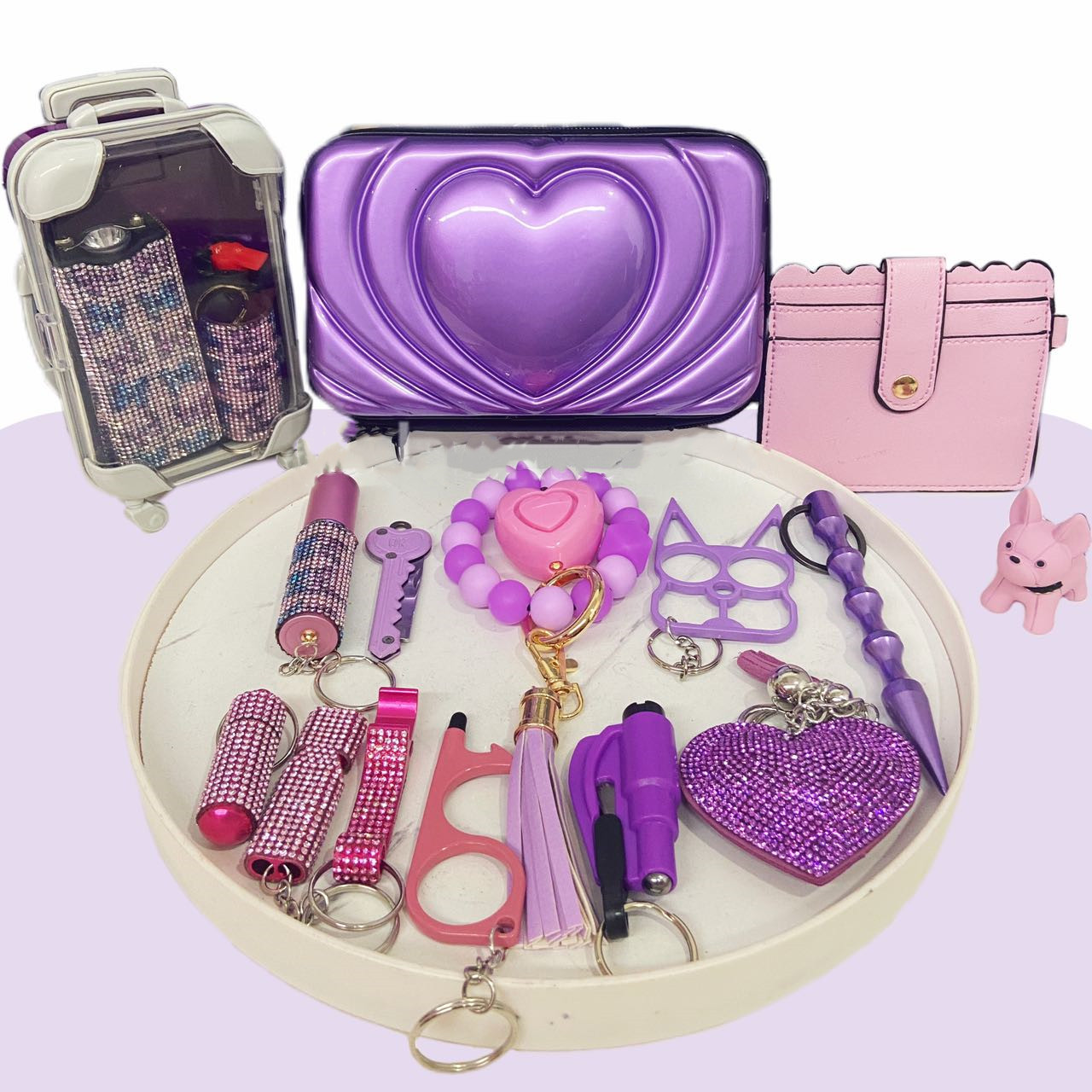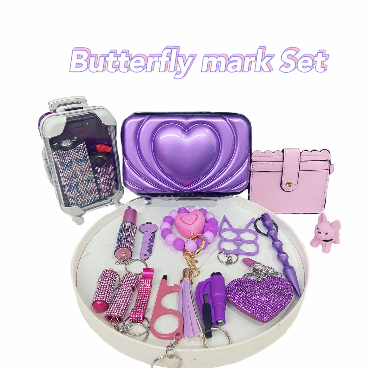 This set is mainly pink and purple, part of the self-defense with a butterfly pattern of self-defense weapons, coupled with cute puppy pendants, the whole set is not only playful and cute, but also to protect your safety.