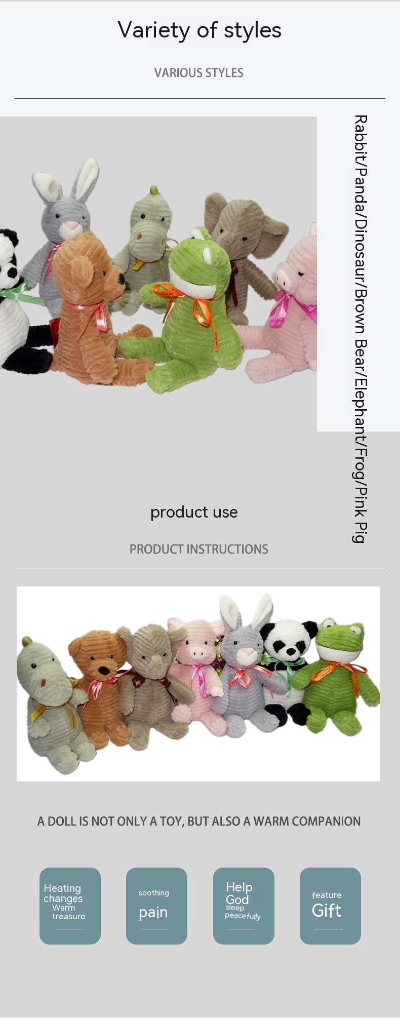 Color: Rabbit (lavender wheat), pink pig (Rose grape seed), baby elephant (Jasmine flaxseed), Panda (lavender wheat), Frog (Jasmine flaxseed), Dinosaur (Rose grape seed), bear (lavender wheat)