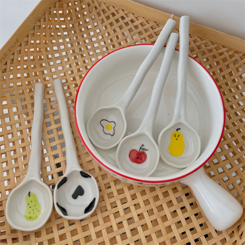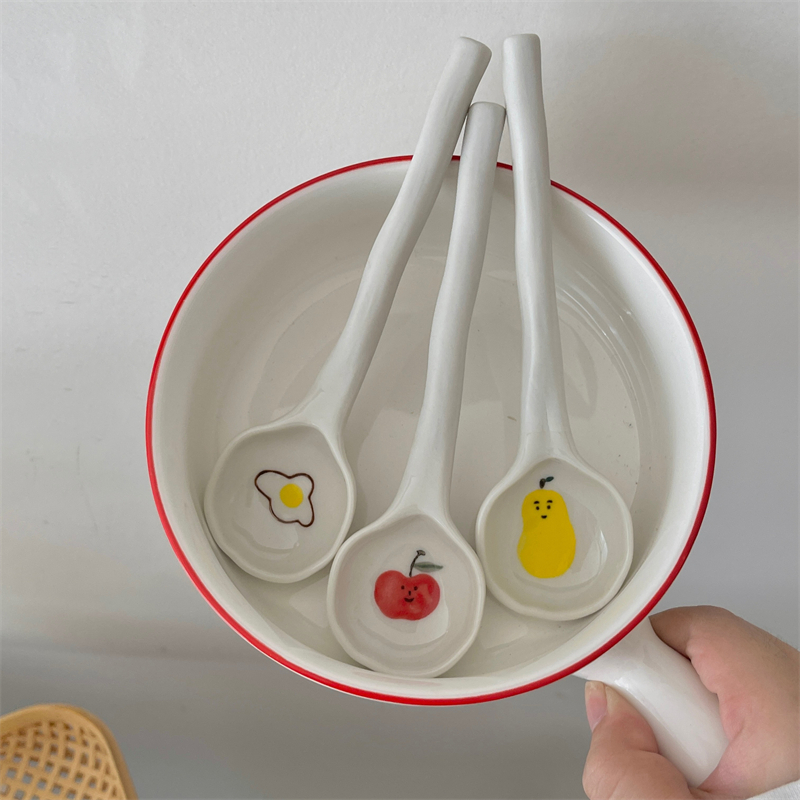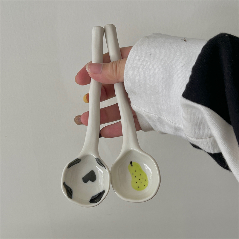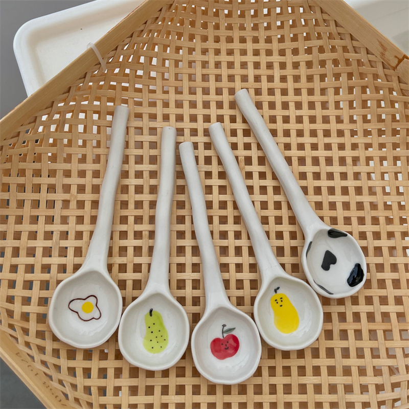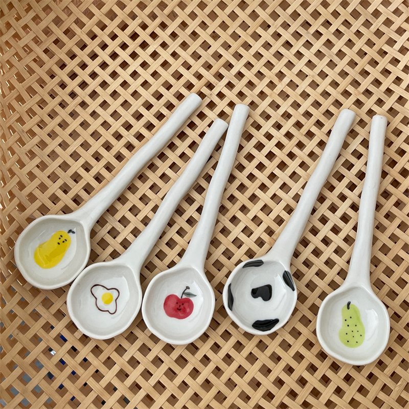 Color: green pear, red apple, yellow pear, cow texture, poached egg