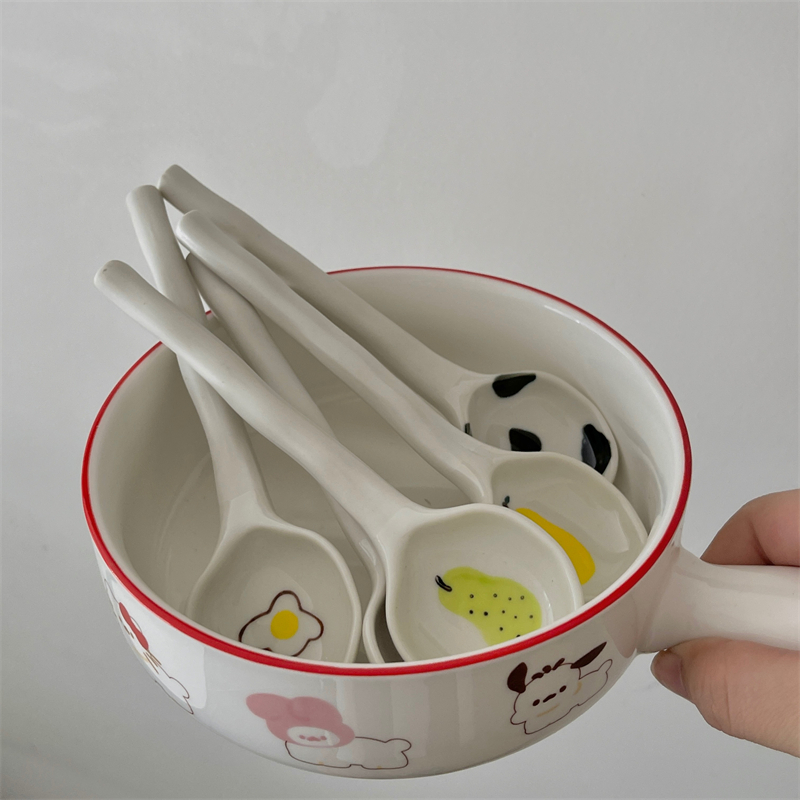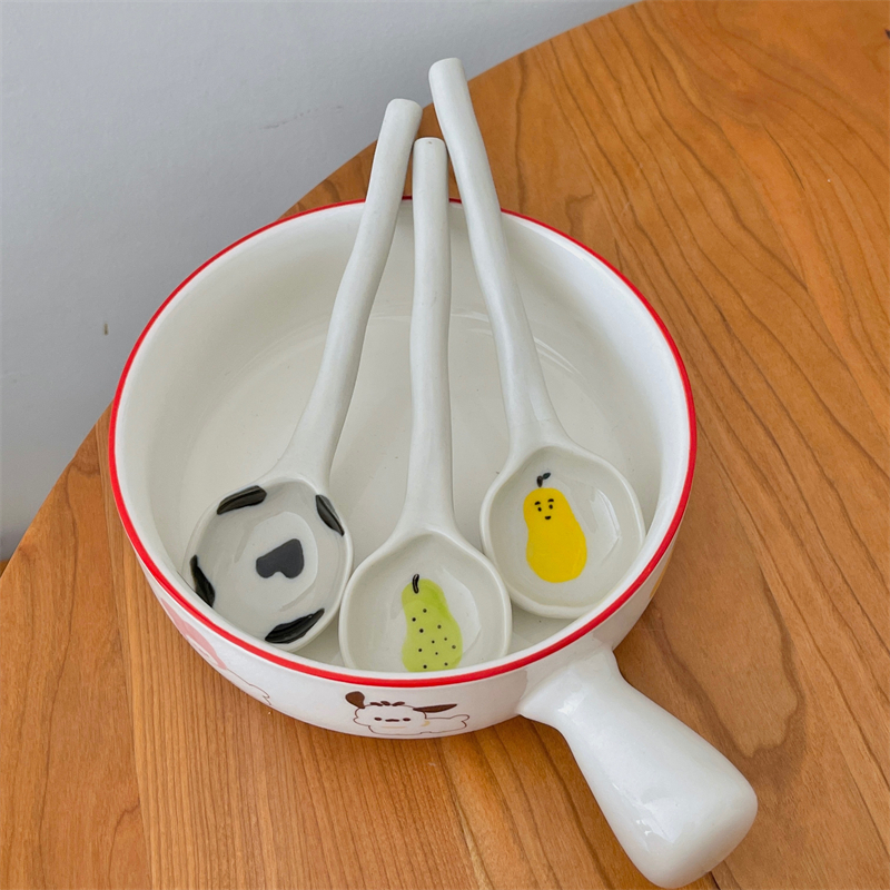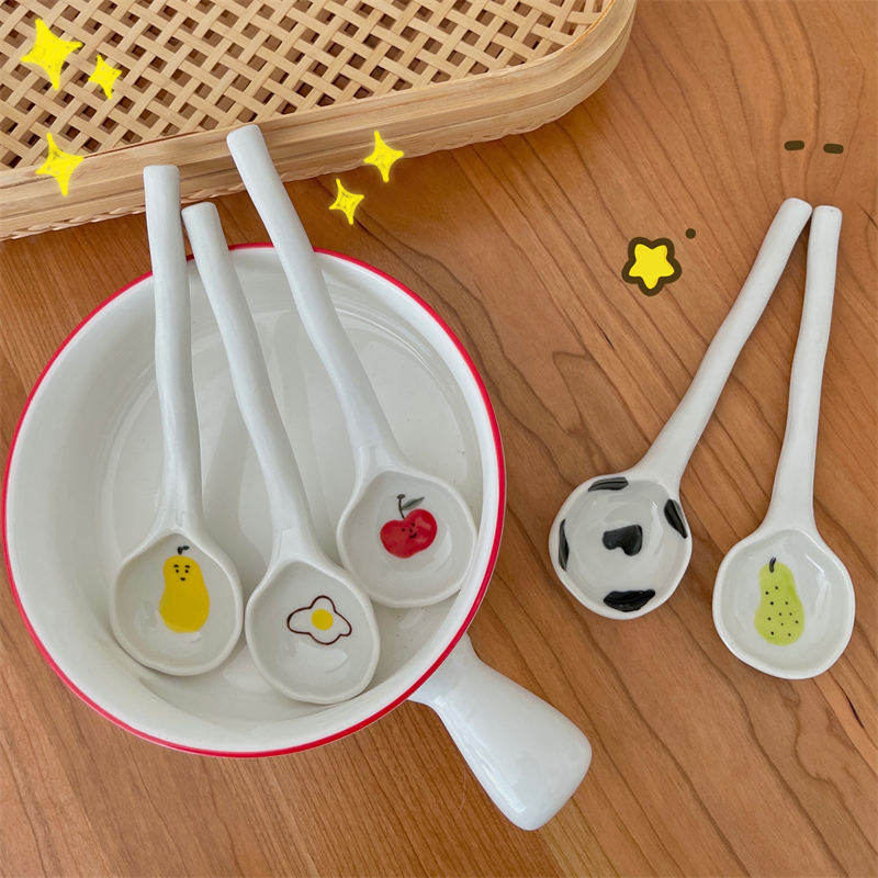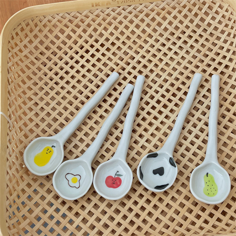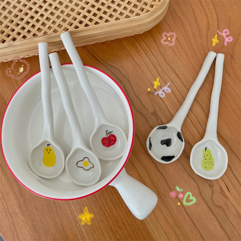 Color: green pear, red apple, yellow pear, cow texture, poached egg
