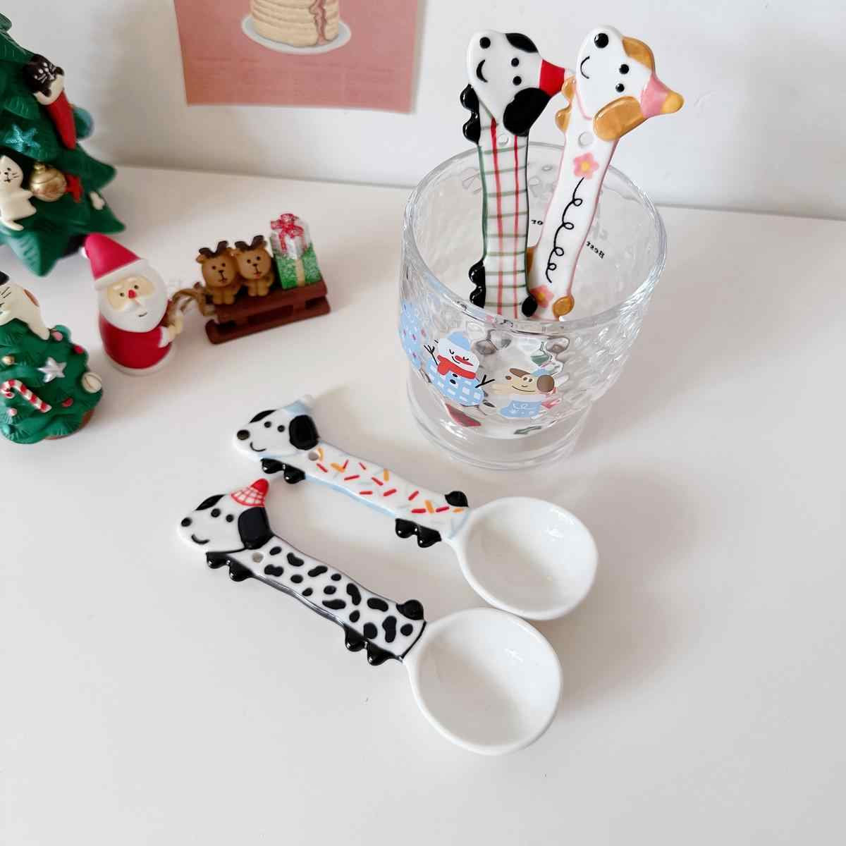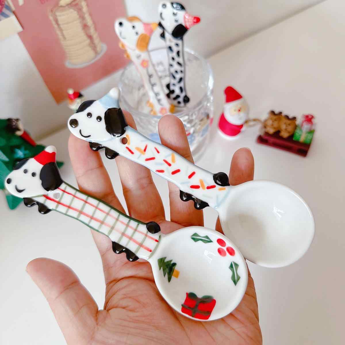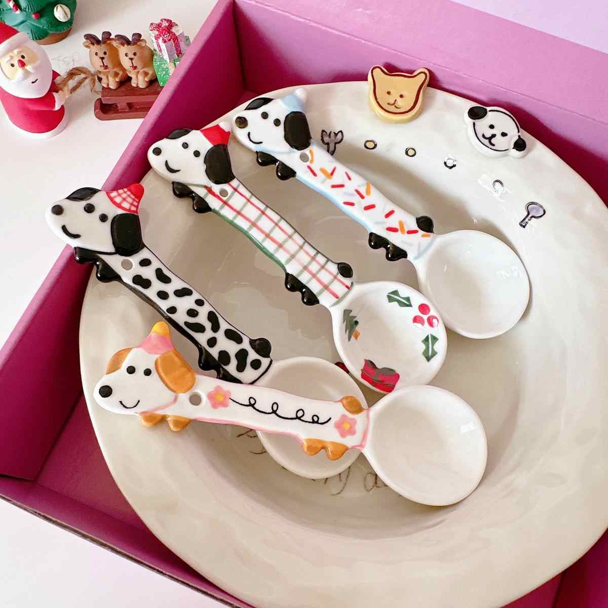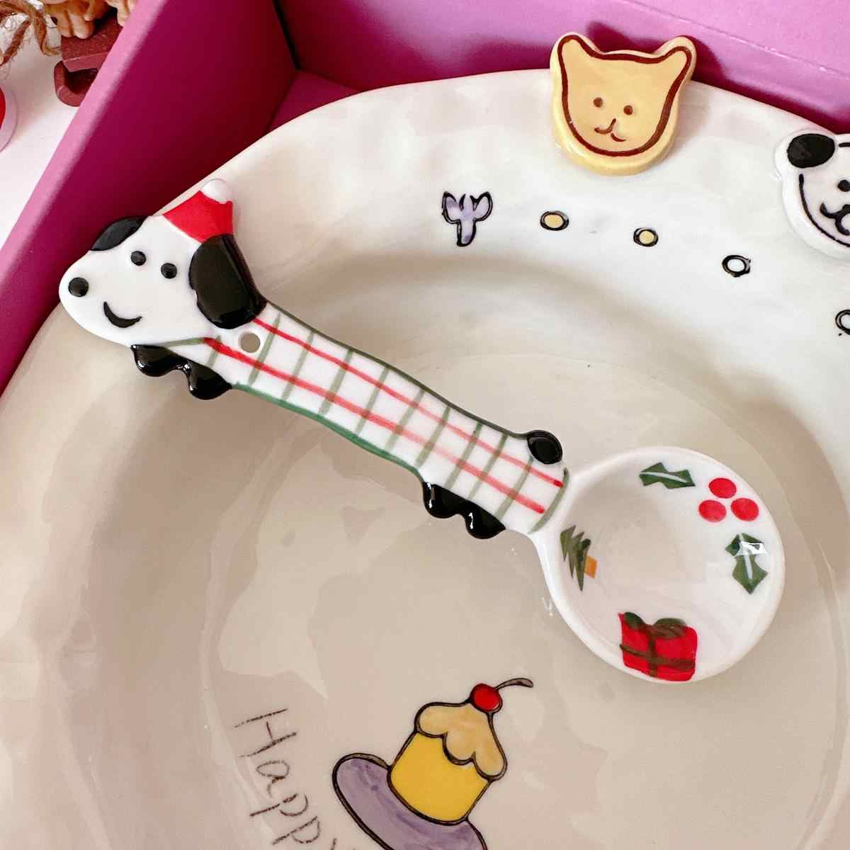 Color classification: Puppy spoon/red and green Christmas style, puppy spoon/blue edge birthday, puppy spoon/black and white dots, puppy spoon/pink flower style