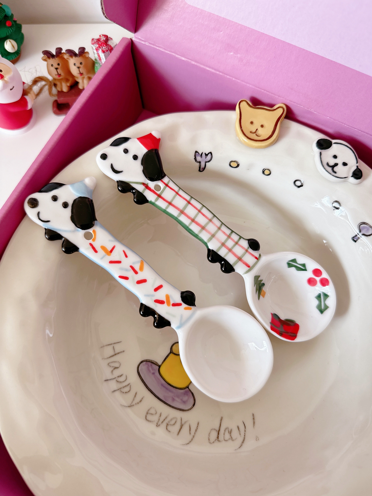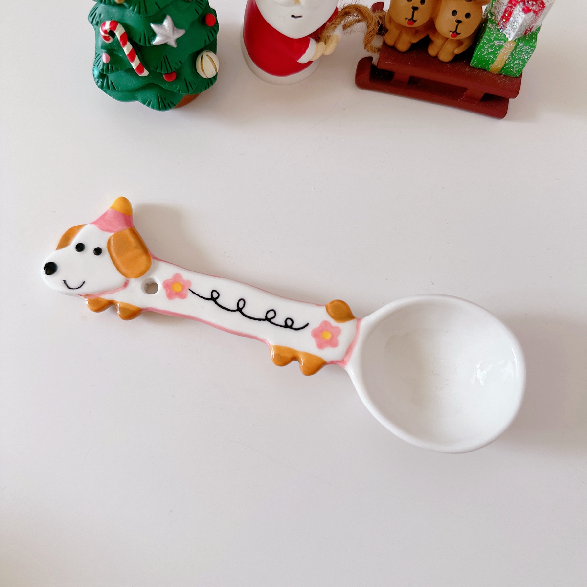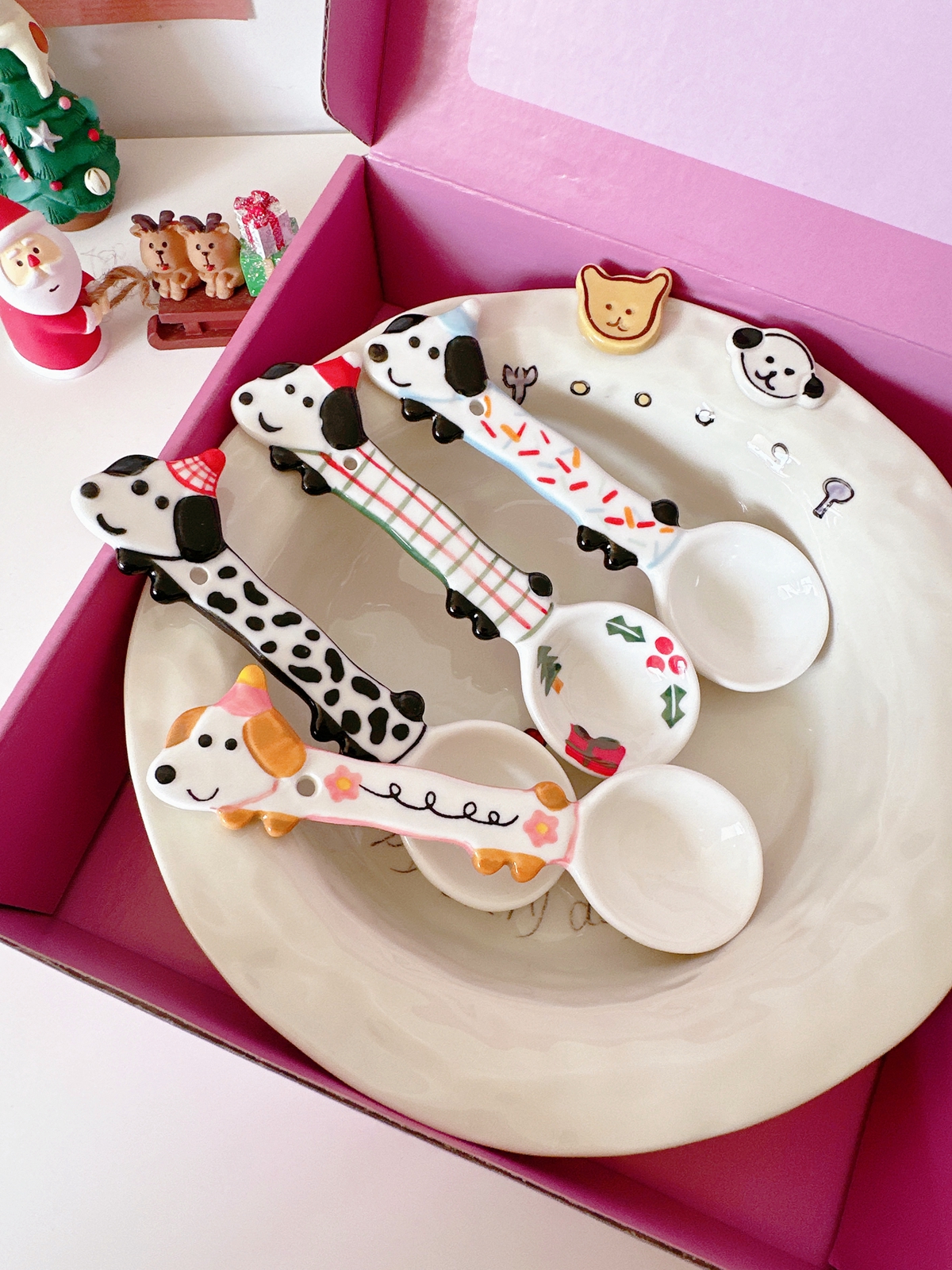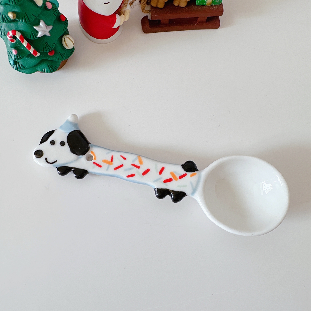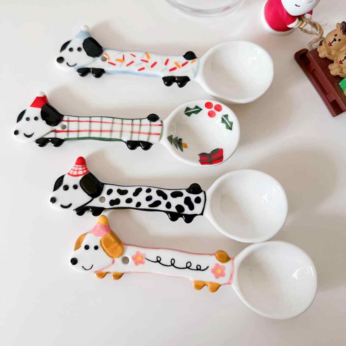 Color classification: Puppy spoon/red and green Christmas style, puppy spoon/blue edge birthday, puppy spoon/black and white dots, puppy spoon/pink flower style