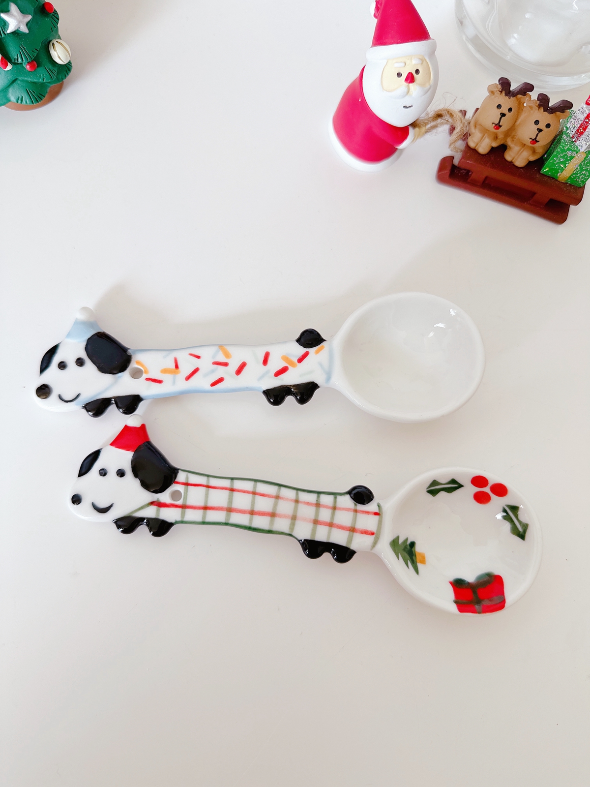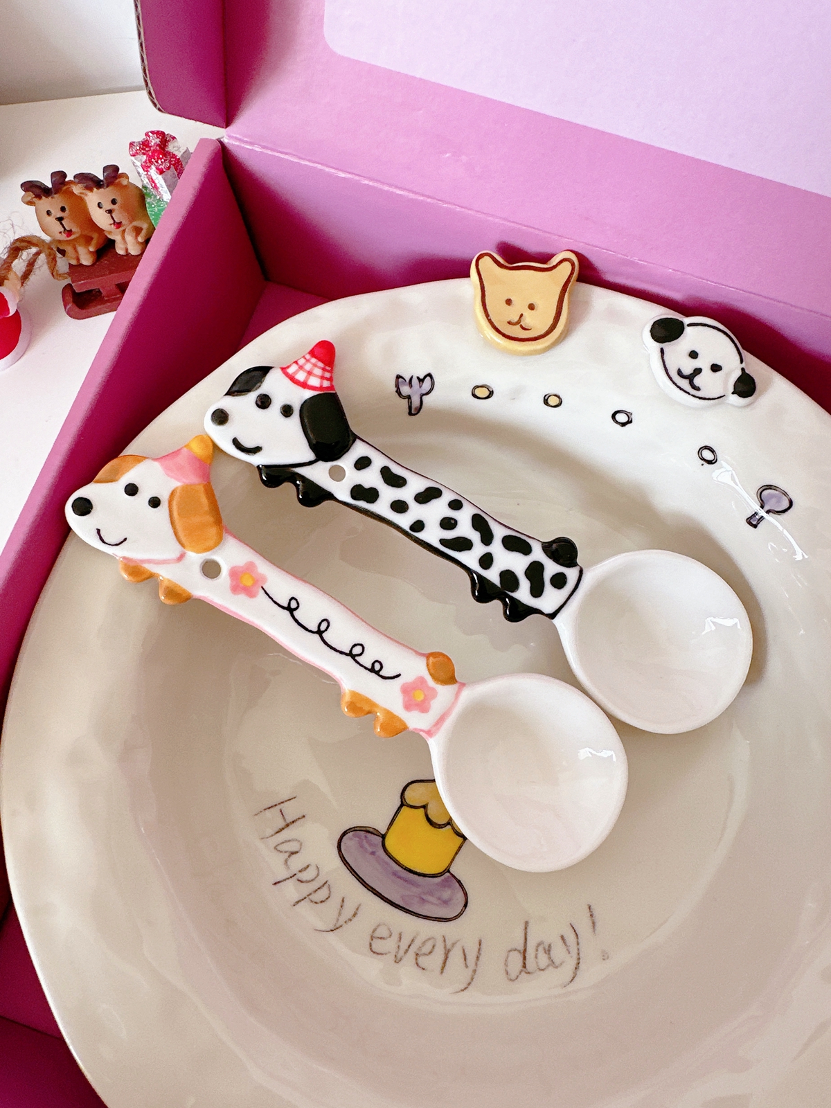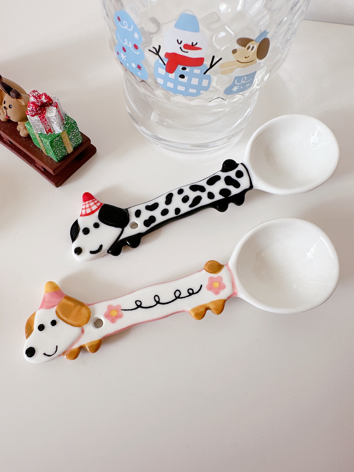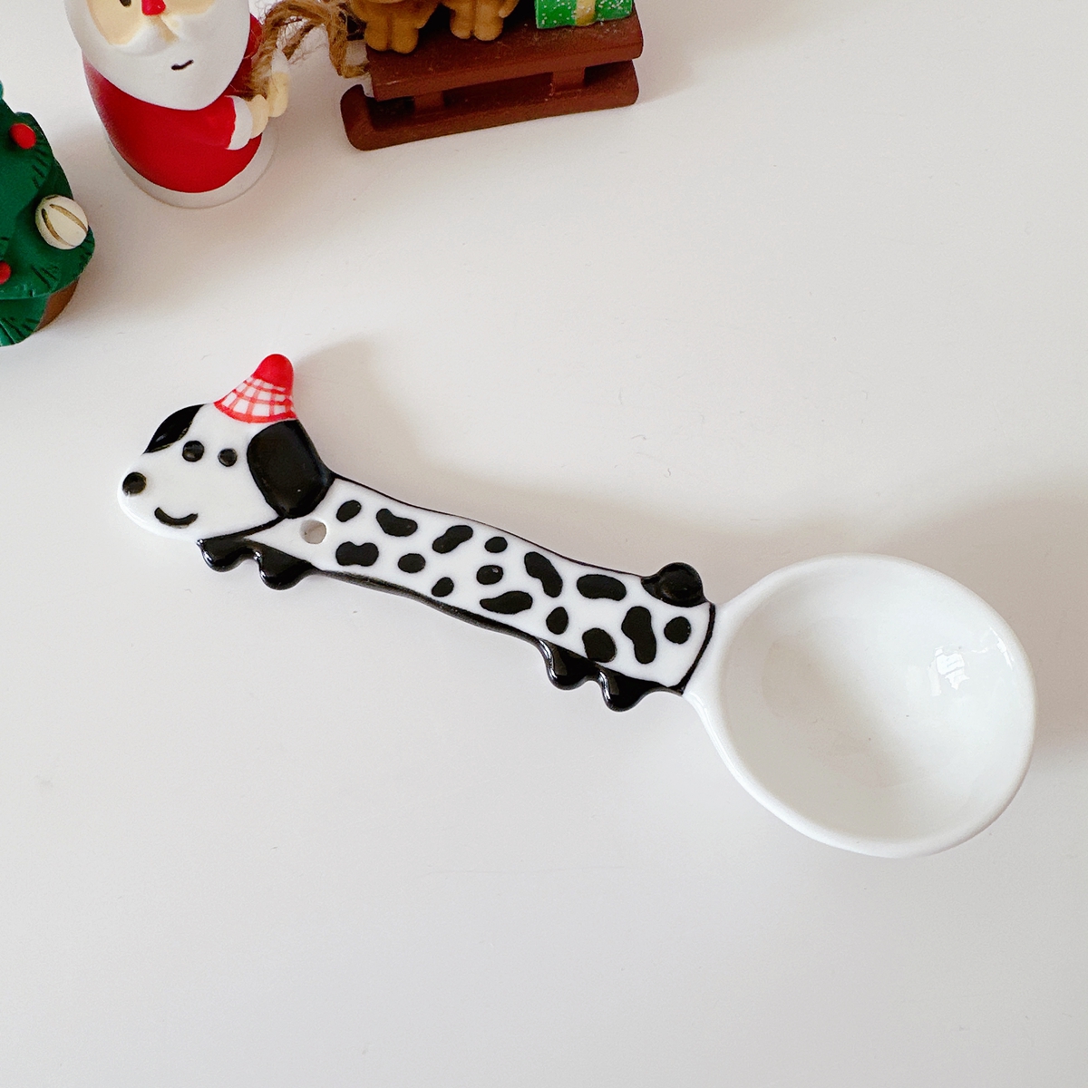 Color classification: Puppy spoon/red and green Christmas style, puppy spoon/blue edge birthday, puppy spoon/black and white dots, puppy spoon/pink flower style