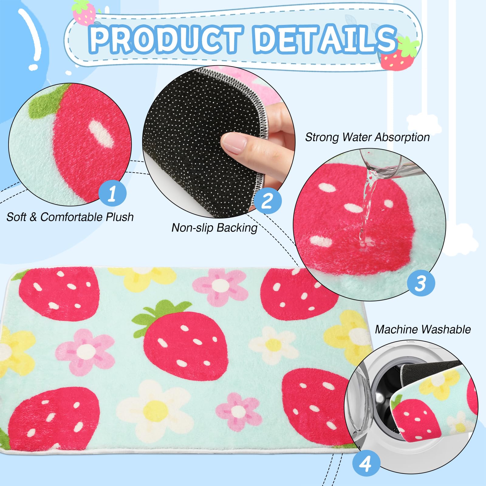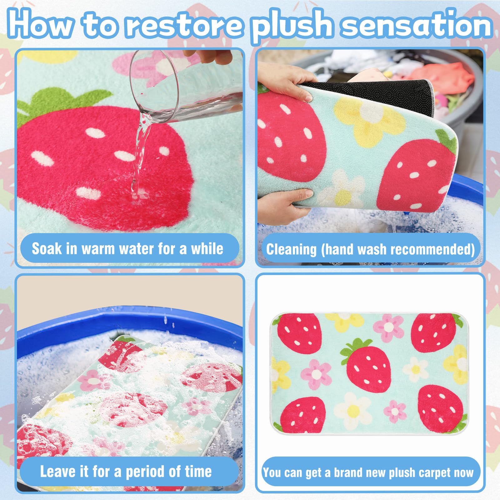 Our strawberry rug is easy to clean. It is recommended to soak strawberry bathroom decor in water for a while after receiving and clean by gentle hand washing. After cleaning, laying flat to dry, the strawberry bathroom rug will restore the original softness and charm