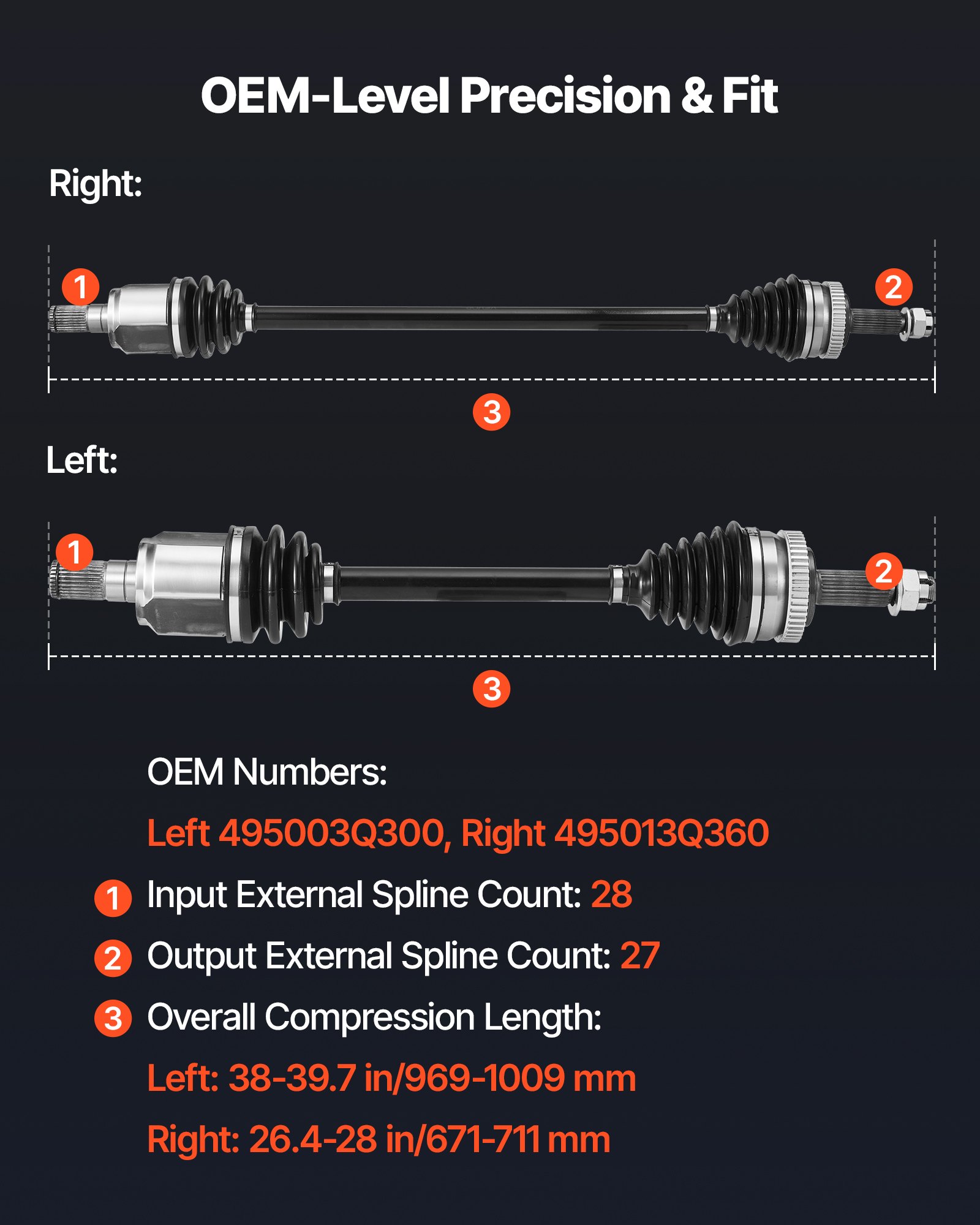 OEM-Level Precision: OEM Numbers: Left 495003Q300, Right 495013Q360; Overall Compressed Length: Left 38–39.7 in, Right 26.4–28 in. The CV joint axle features a 28-tooth external spline input shaft and 27-tooth external spline output shaft