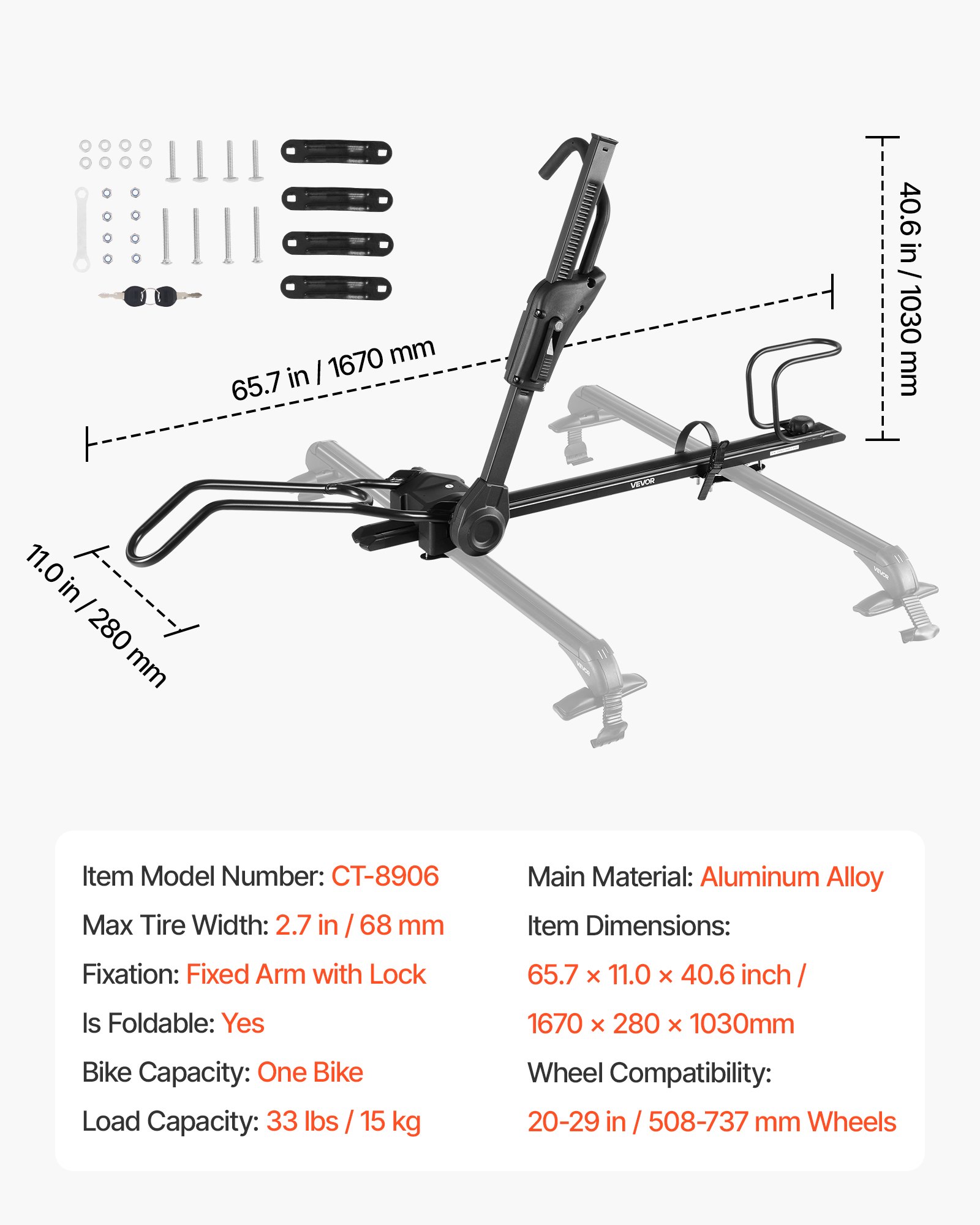 Tragfähigkeit: 33 lbs/15 kg, Gefaltete Produktgröße (L x B x H): 43,3 x 8,3 x 23,2 Zoll / 1100 x 210 x 590 mm, Fahrradkapazität: Ein Fahrrad, Hauptmaterial: Aluminiumlegierung, Produktgröße (aufgeklappt) (L x B x H): 65,7 x 11,0 x 40,6 Zoll / 1670 x 280 x 1030 mm,Artikelmodellnummer: CT-8906, Befestigung: Fester Arm mit Schloss, Radkompatibilität: 20-29 Zoll / 508-737 mm Räder, Maximale Reifenbreite: 2,7 Zoll / 68 mm