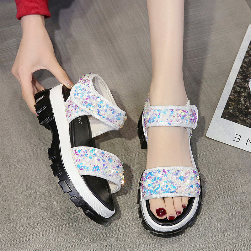 Daddy Sports Sandals Women's Sequined Sponge Cake Thick-soled Velcro Beach Sandals