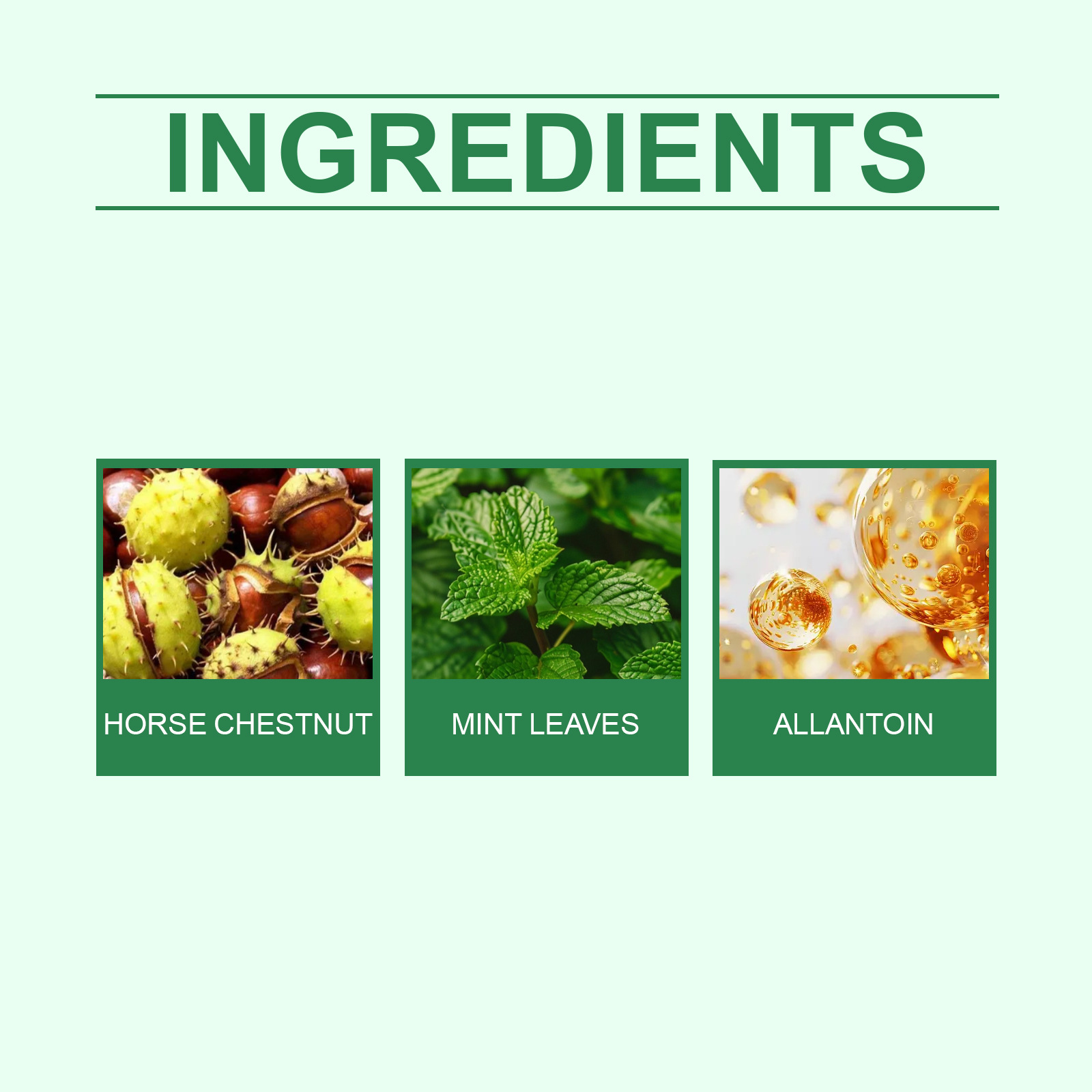 Product information:Ingredients: horse chestnut, mint leaves, allantoin.