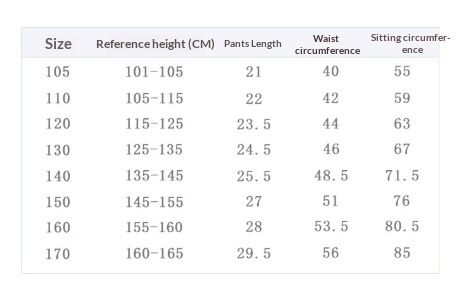 Suitable heights: Size 110 (height 110-120 cm), Size 120 (height 120-130 cm), Size 130 (height 130-140 cm), Size 140 (height 140-150 cm), Size 150 (height 150-160 cm), Size 160 (height 160-165 cm), Size 170 (height 165-170 cm)