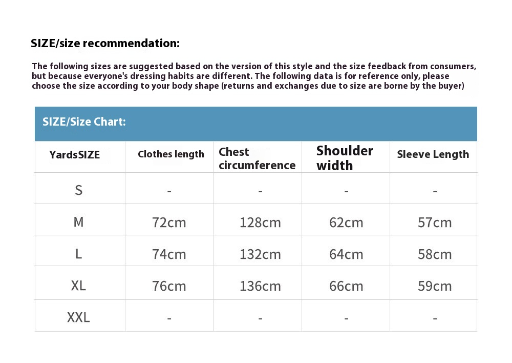 Note: 1. Asian sizes are 1 to 2 sizes smaller than European and American people. Choose the larger size if your size between two sizes. Please allow 2-3cm differences due to manual measurement. 2. Please check the size chart carefully before you buy the item, if you don't know how to choose size, please contact our customer service. 3.As you know, the different computers display colors differently, the color of the actual item may vary slightly from the following images.