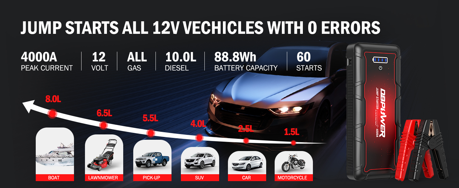 4000A JUMP STARTER: The DBPOWER G60 car jump starter provides up to 4000A peak current, it can start all gasoline engines and up to 10.0L diesel engines in just a few seconds. This lithium battery booster designed with heavy-duty clamps and cables, can quickly jump start all 12V dead car battery for up to 60 jump starts on a single charge. It is suitable for cars, trucks, motorcycles, boats, RVs, tractors, and more. You can easily and quickly solve problems by yourself SAFETY PROTECTION SYSTEM: This portable car jump starter is very safe and easy to use. The all-metal jumper clamps are designed to be sturdy and durable, it provides versatile protection systems including low/high voltage, over-temperature, short-circuit, reverse polarity and jump starter time out protection, without the worry of incorrect connections or sparks. The excellent conductivity and durability can start your battery quickly and safely, even in extreme temperatures (-4°F~140°F) 88.8Wh Power Bank: You can use this car jump starter as a 88.8Wh power bank. It designed with 2 USB outputs (5V/9V/12V and 5V/2.1A), 1 DC output (12-16.8V/10A) and 1 Type-C in(out) port (5V/3A). Can be compatible with almost all USB charging devices, such as smartphones, tablets, cameras, GPS systems, and more. It also can be used to power any DC devices and car accessories, like tire inflator, car vacuum cleaner, car refrigerator, etc PORTABLE AND MULTIFUNCTIONAL: The size of our portable car jump starter is 8.7 *3.5 *1.6 inches, the weight is 1.56lb, which makes it portable in your car emergency kit, glove box, or even bag. It also comes with a super bright LED light with 3 modes (lighting/flash/SOS), which is used as an emergency flashlight with strobe and SOS signal. This multi-purpose flashlight is great for camping, outdoors, indoors, travel, etc. It can help you in any situation What You Get: DBPOWER G60 jump starter made of rugged ABS material, waterproof, dustproof and drop-proof, can prevent damage from rain, dust, and external shocks, making it suitable for use in various complex work scenarios. The package includes a G60 Jump Starter x1, Smart Jump Cable x1, USB Type-C Charging Cable x1, Storage Bag x1 and User Manual x1