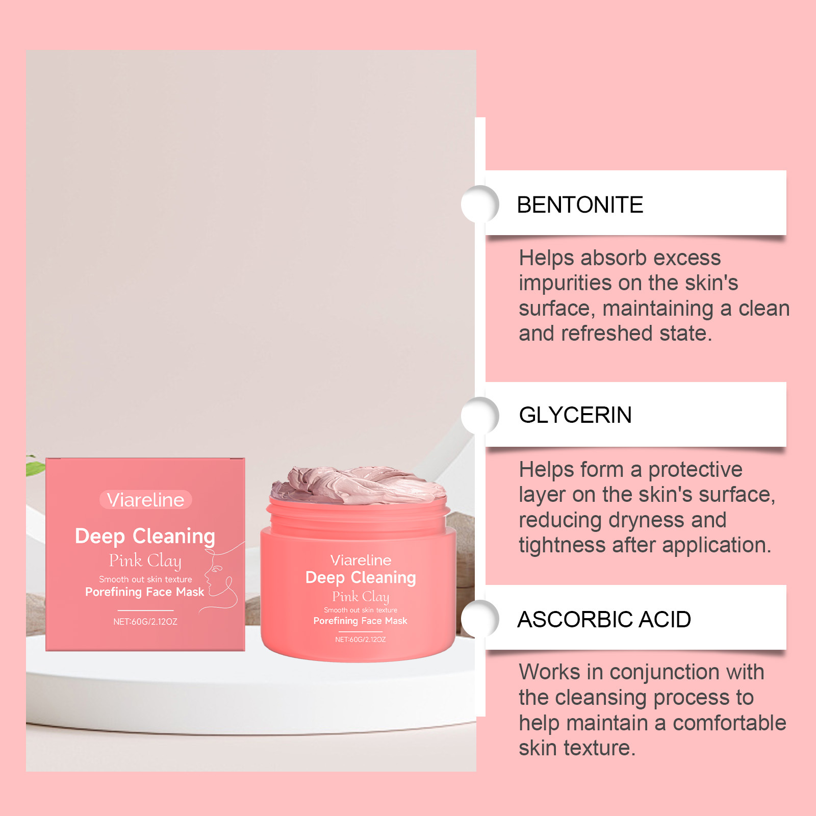 Ingredients: water, bentonite, glycerin, propylene glycol, ascorbic acid (vitamin C), glyceryl stearate, mineral oil, 1,2-hexanediol, hydrolyzed collagen, triethanolamine, retinol, Validium morifolium extract, lactic acid.