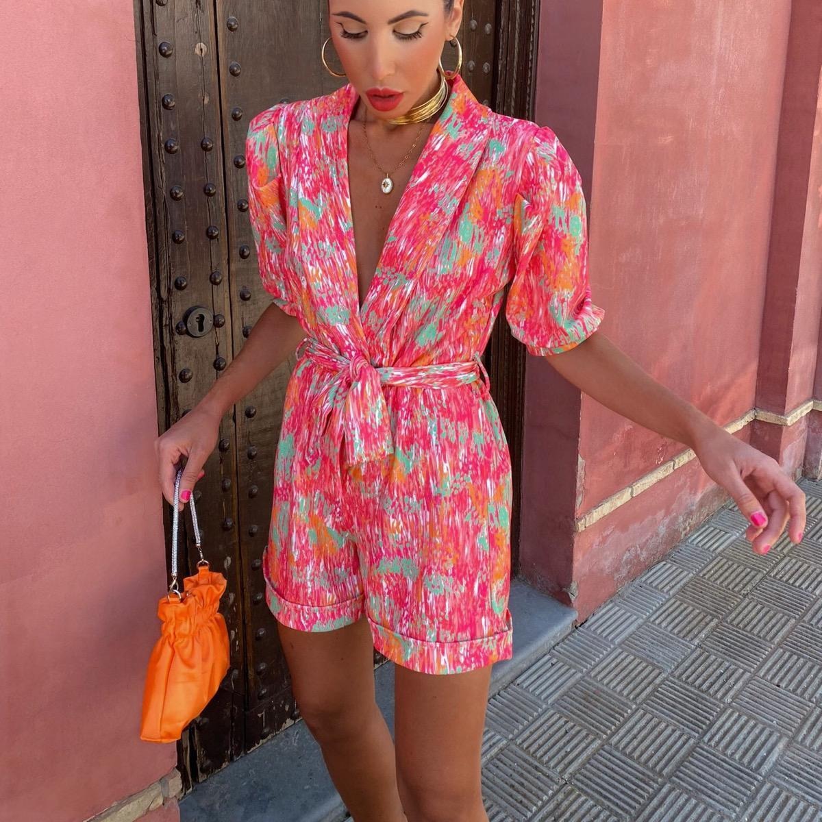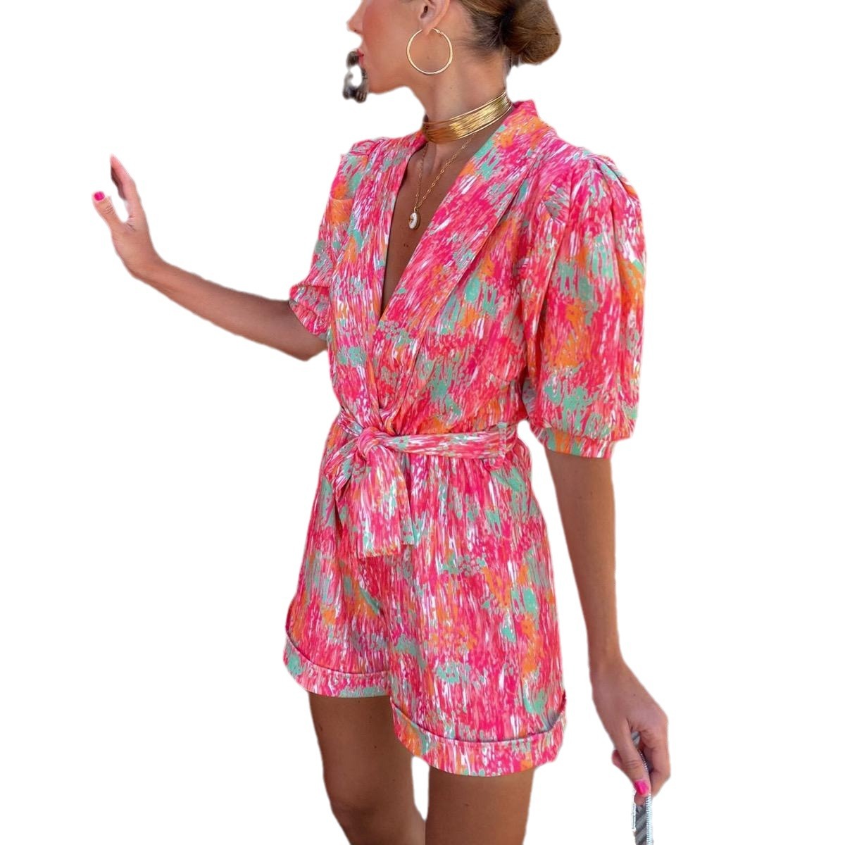 Deep V-neck Puff Short Sleeve Printed Elastic Waistband Pocket Shorts Jumpsuit