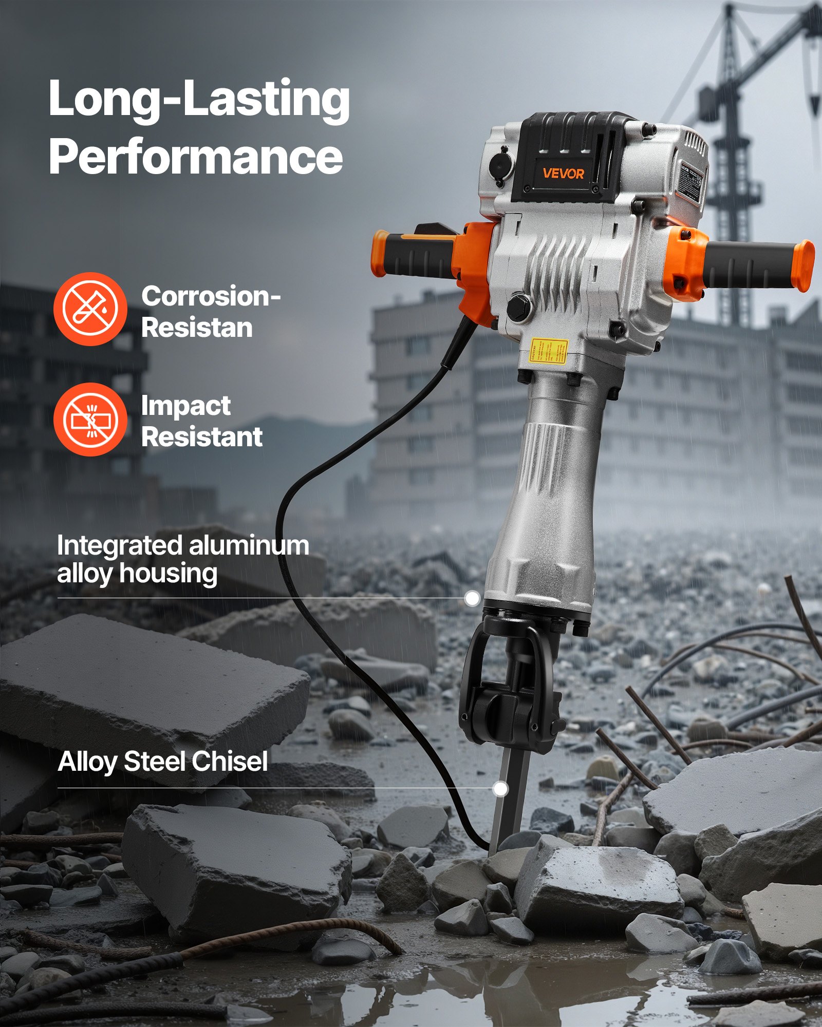 Built to Last: Featuring a one-piece aluminum alloy housing, this demolition hammer is both lightweight and strong. Paired with alloy steel chisels, it withstands harsh job sites while minimizing wear