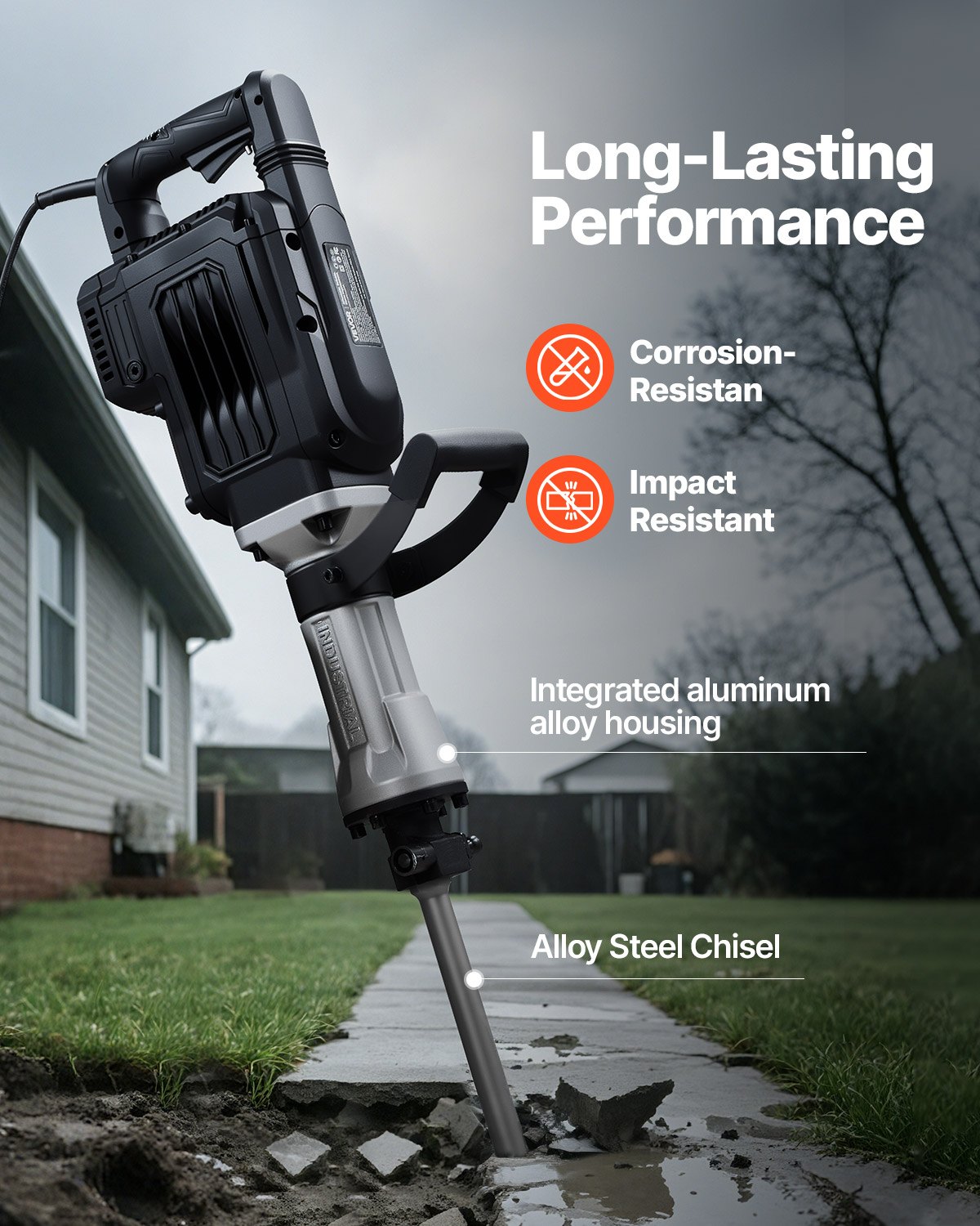 High-Performance Motor: Powered by a 3000W motor delivering up to 1700 BPM, this demolition jack hammer tackles heavy-duty tasks with speed and efficiency—ideal for both home use and commercial projects