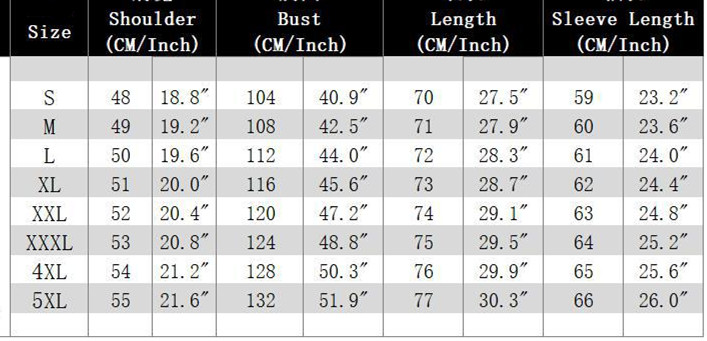Size M, L, XL, XXL, XXXL, XXXXL, 5XL, 6XL, 7XL