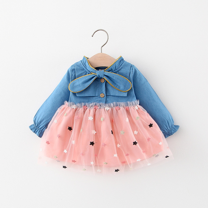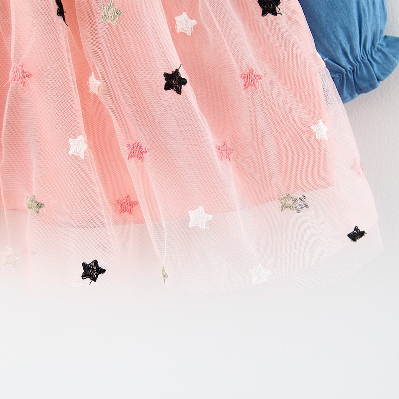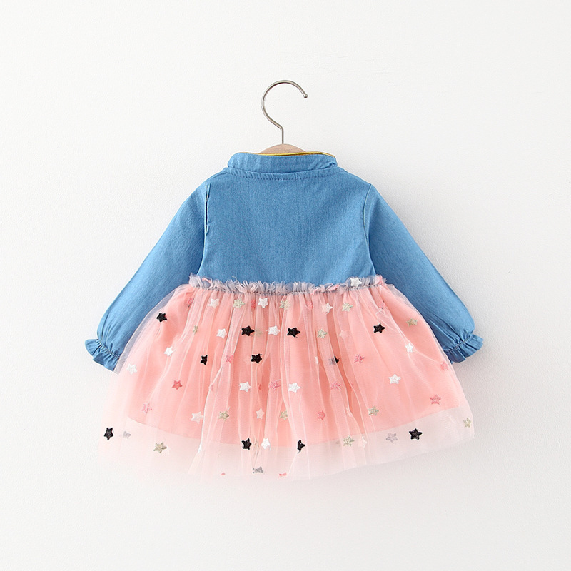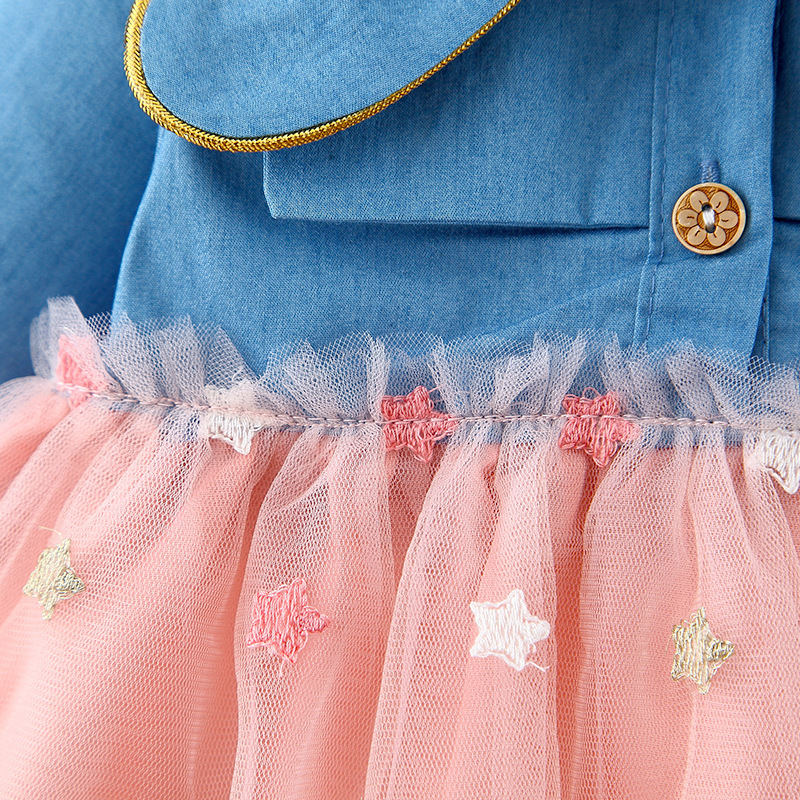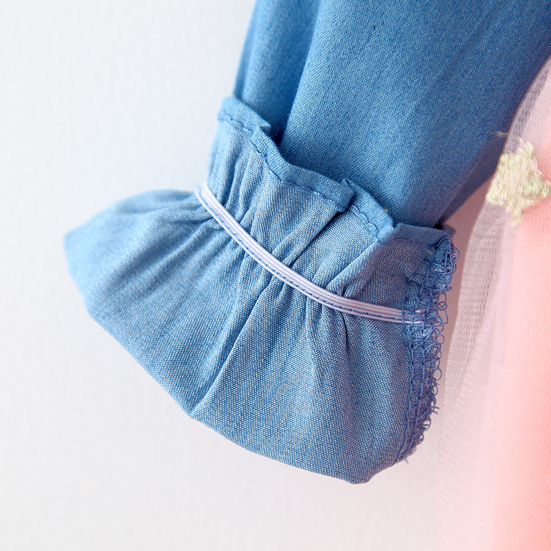 Denim Mesh Stitching Long Sleeves Princess Dress