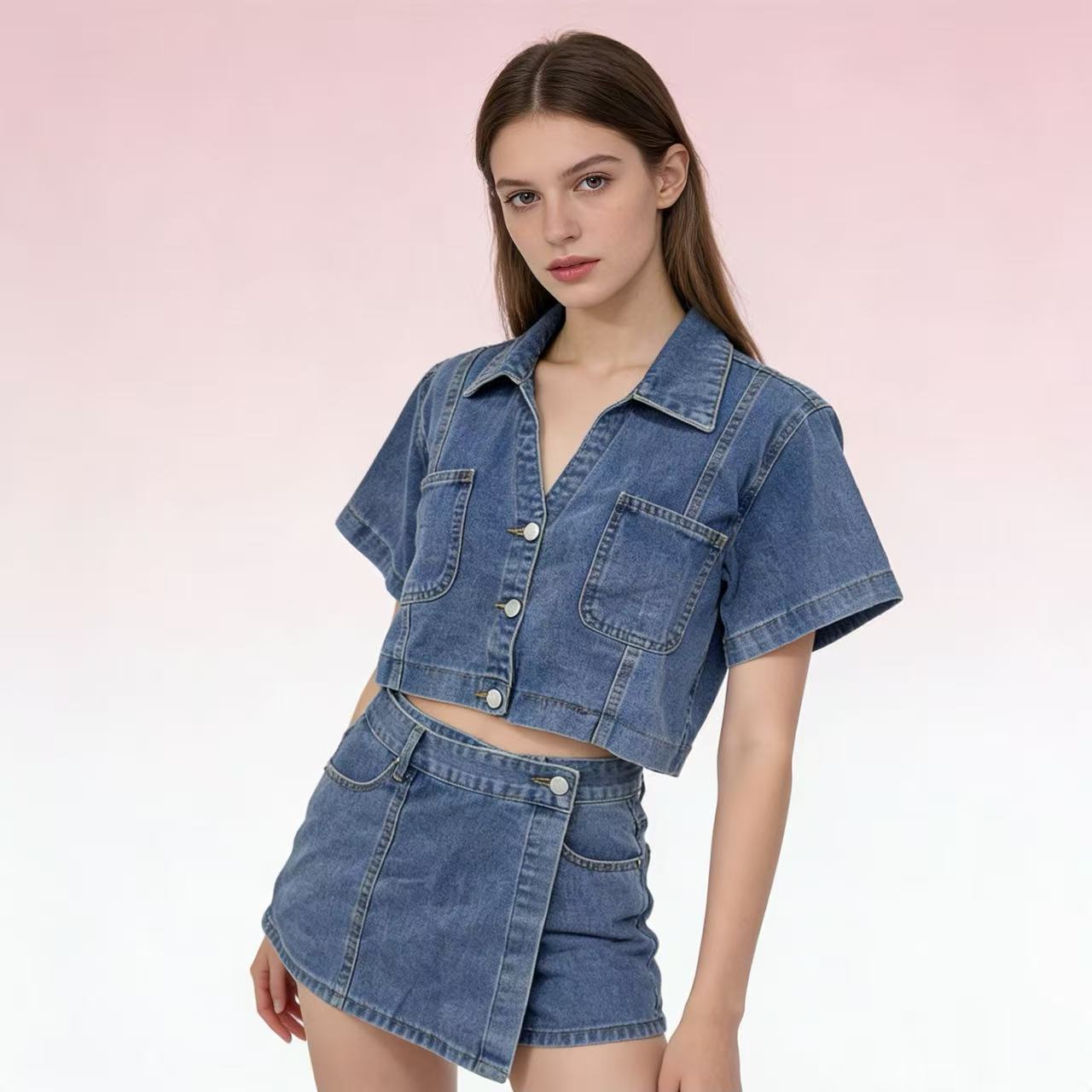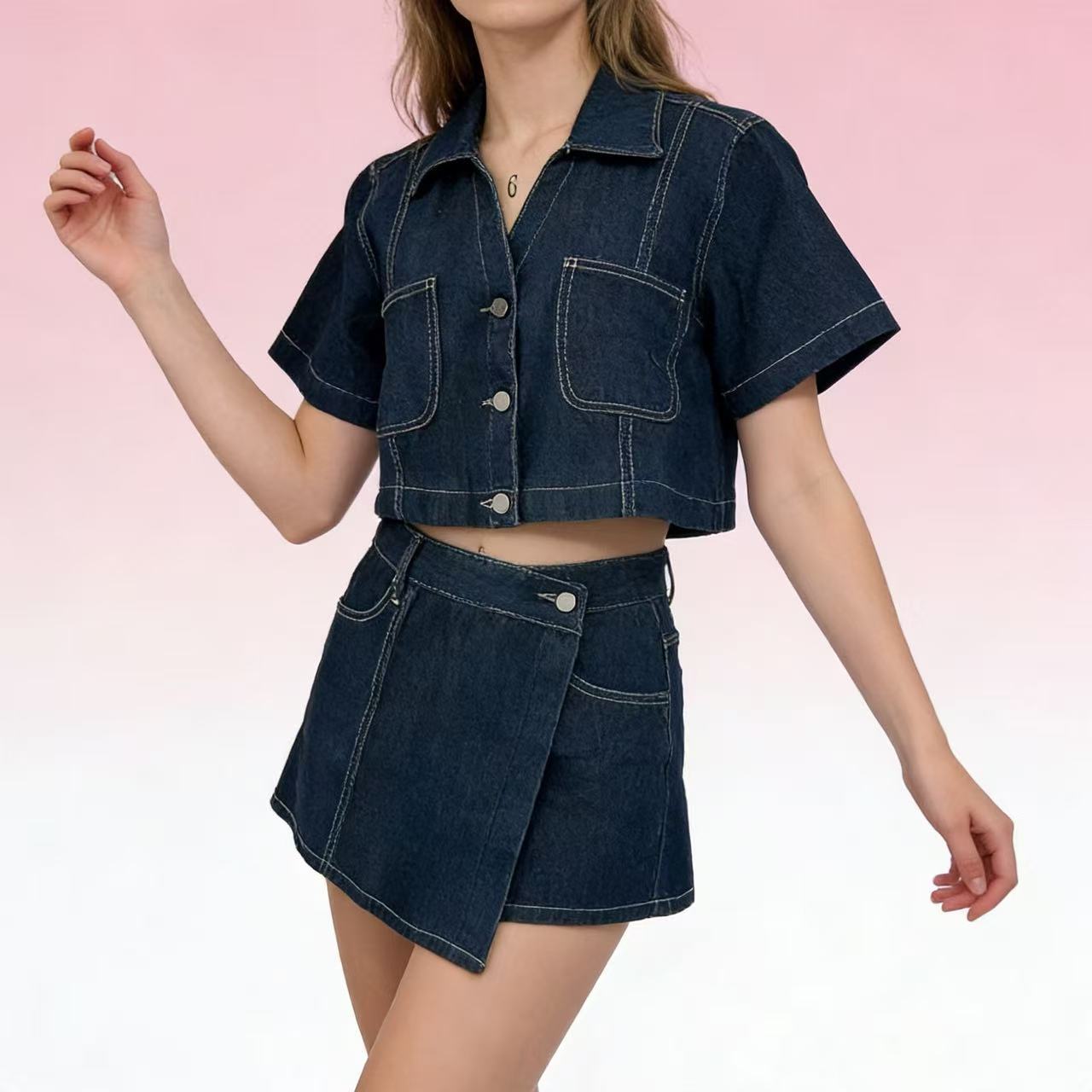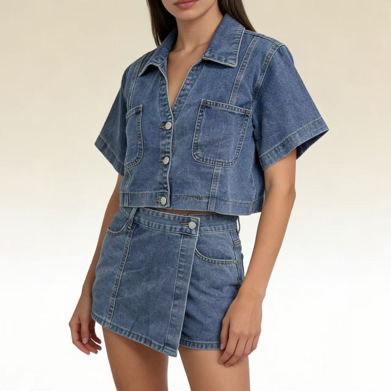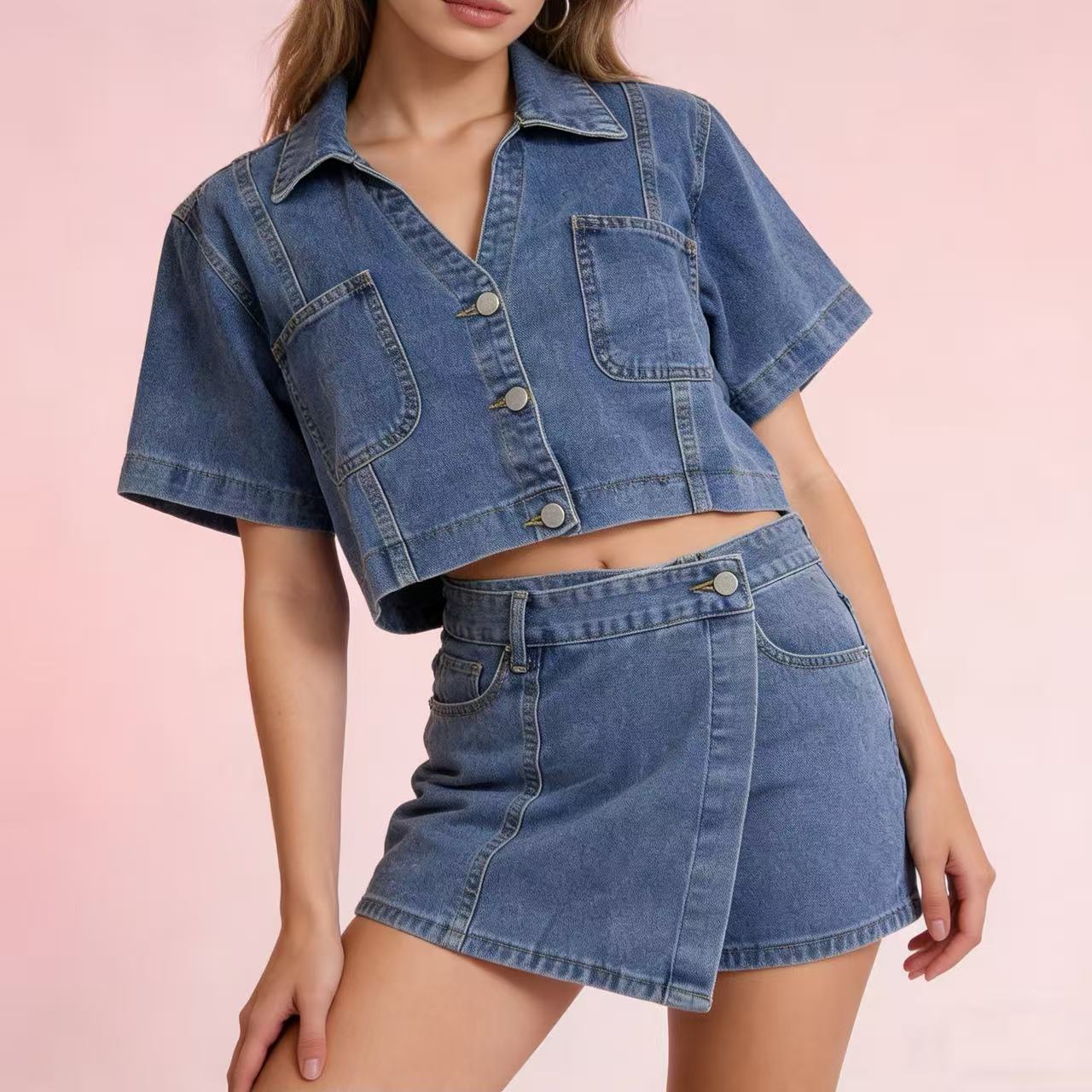 Denim Shirt And Skort Set Stylish Two-Piece Summer Loose And Comfortable Denim Outfit