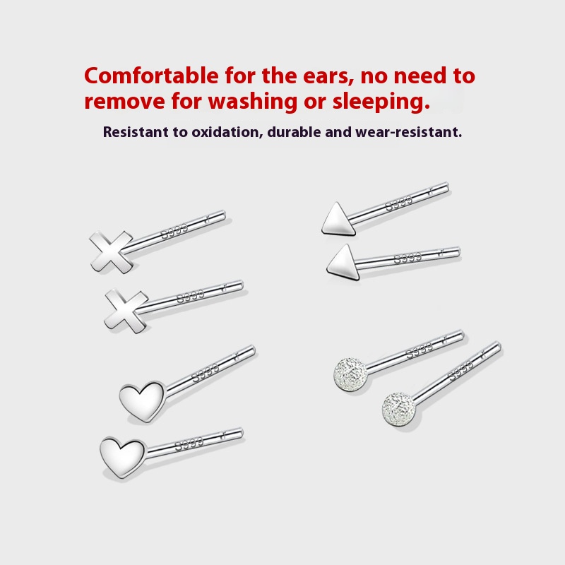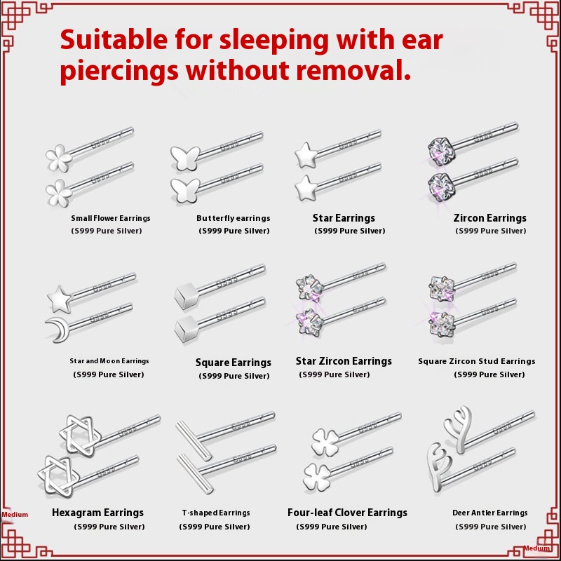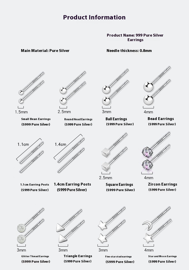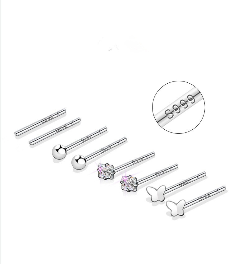 Color: [999 pure silver] Butterfly studs, [999 pure silver] T shape ear studs, [999 pure silver] star and moon ear studs, [999 pure silver] Star ear studs, [999 pure silver] small flower ear studs, [999 pure silver] triangle ear studs, [999 pure silver] hexagram stud earrings, [999 pure silver] antler-shaped earrings, [999 pure silver] Flash yarn 3mm ear studs, [999 pure silver] plus ear studs, [999 pure silver] Four Leaf Clover ear stud, [999 pure silver] love heart stud earrings, [999 pure silver] 4mm four-claw zircon ear studs, [999 pure silver] 4mm square zircon ear studs, [999 pure silver] 4mm star zircon ear studs, [999 pure silver] 4mm bead ear studs, [999 pure silver] 3mm ball ear studs, [999 pure silver] 2.5mm round head ear studs, [999 pure silver] 1.5mm adzuki beans ear studs, [999 pure silver] 11mm ear bar, [999 pure silver] 14mm ear bar, [999 pure silver] Square ear studs