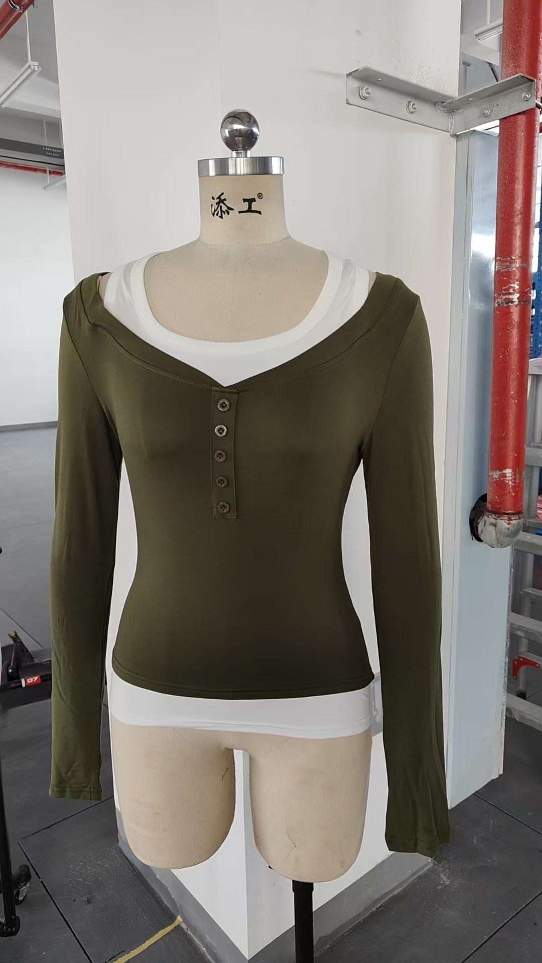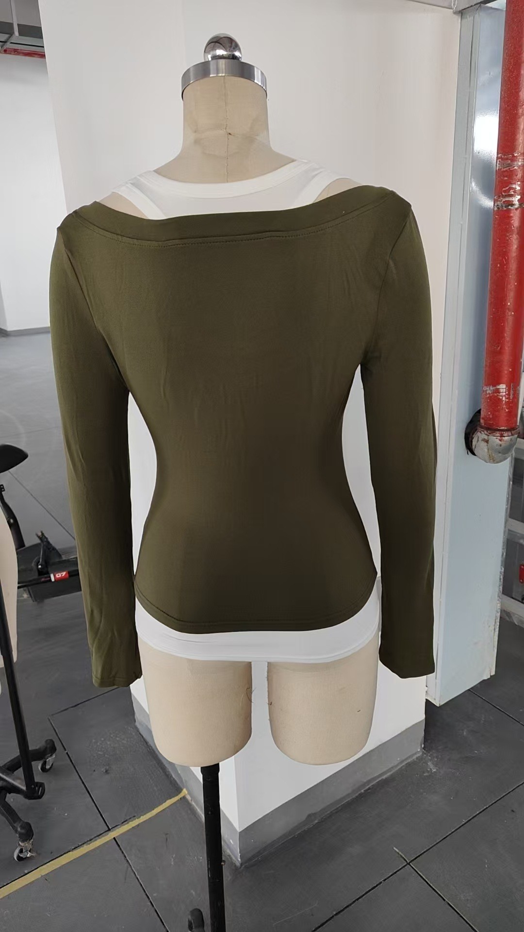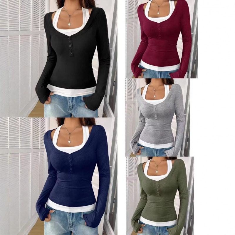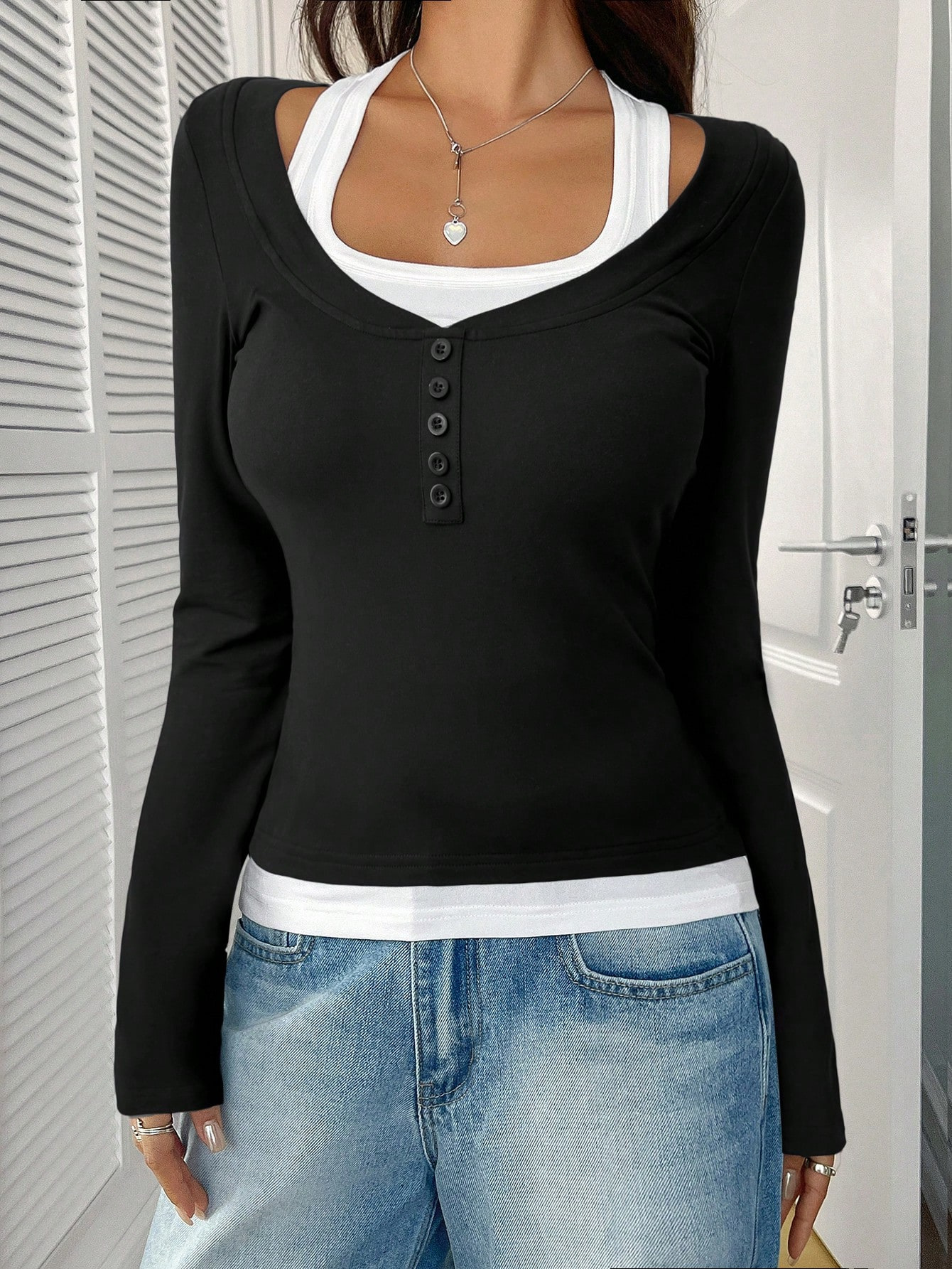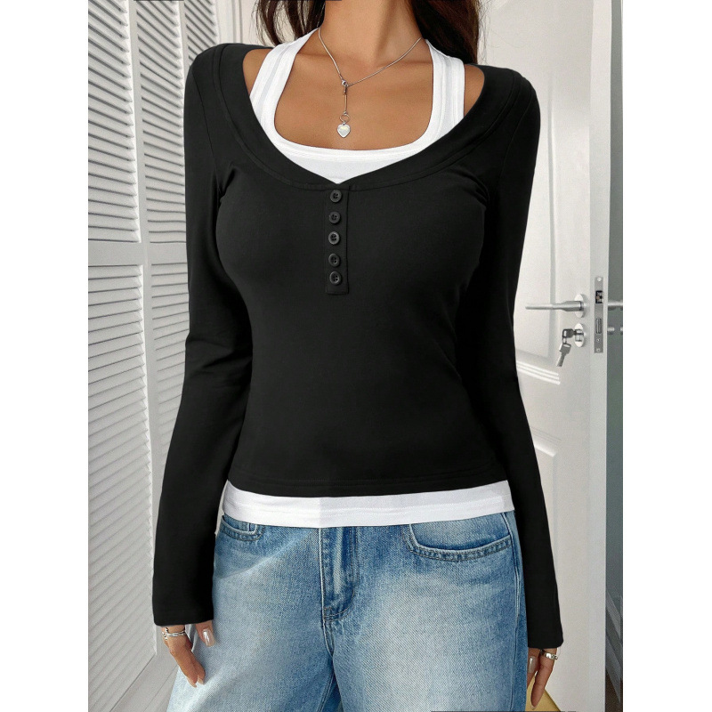 Designer-style Halterneck Faux Two-tone Stretch Long-sleeve Top