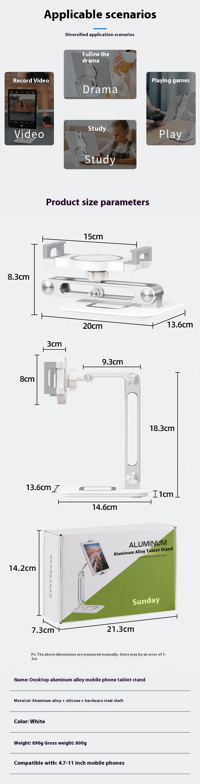 Product information:Color: White Product Size: folded size 20*13.6*8.3cm, total length 15cm Material: aluminum alloy