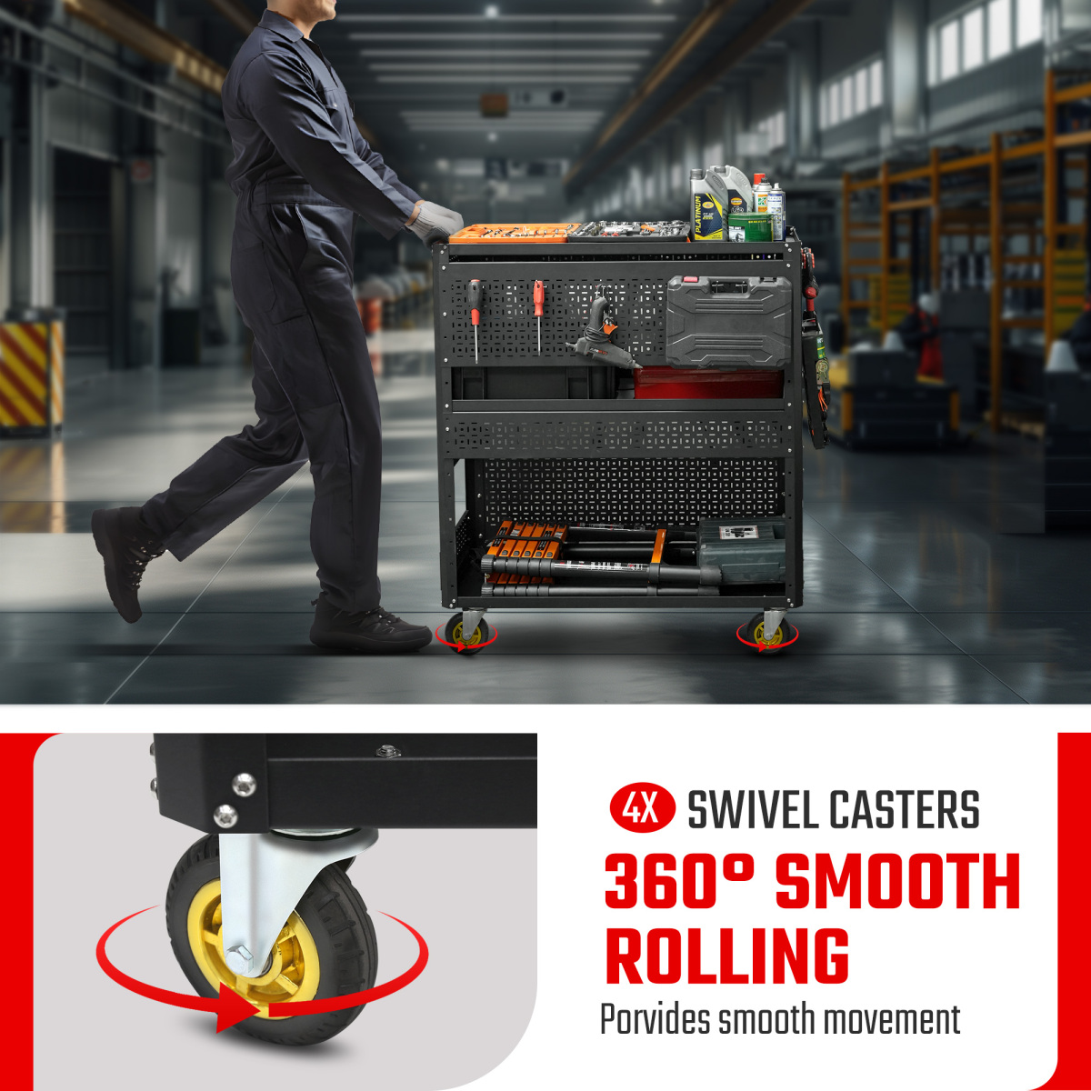 Sturdy and Mobile Tool Cart : This 3-tier tool cart is made of high-quality steel, easy mobility and stability. The storage cart has 4 rolling wheels perfect for transporting tools across various surfaces, from concrete floors to workshop tiles. You can load various tools and supplies, making your job more efficient.