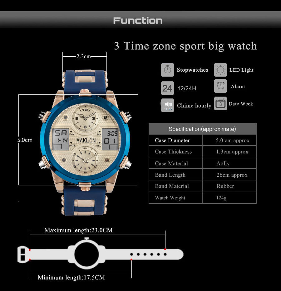 Special functions: calendar, 24-hour indication, GMT dual time, week display, month display
