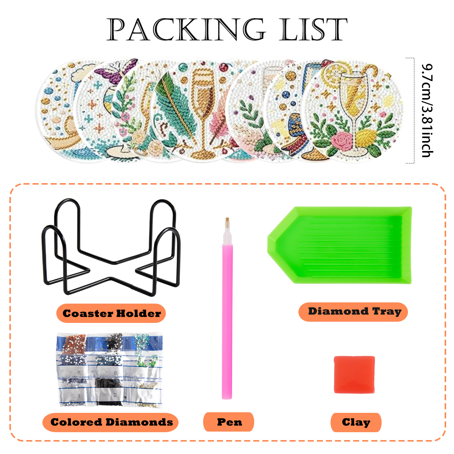 【Package Includes】Artificial Diamond Painting Coaster x 8, Coaster Holder x 1, Clay Glue x 1, Pen x 1, Diamond Tray x 1