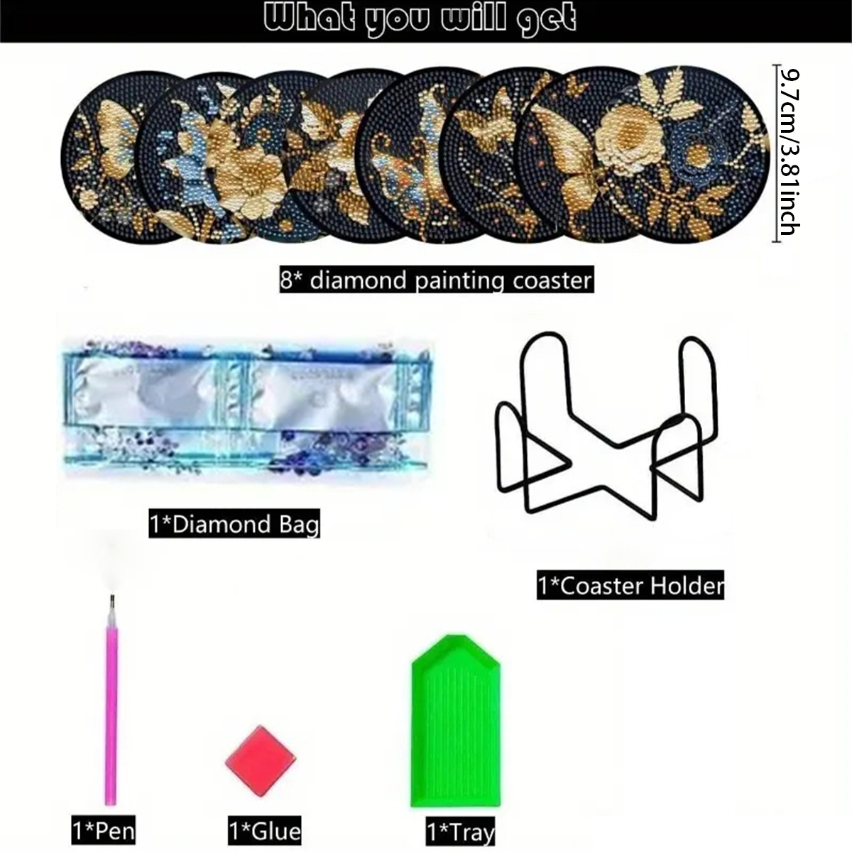 【Package Includes】Artificial Diamond Painting Coaster x 8, Coaster Holder x 1, Clay Glue x 1, Pen x 1, Diamond Tray x 1