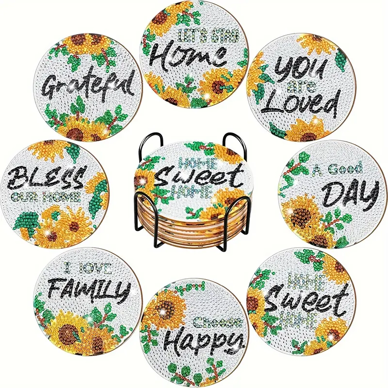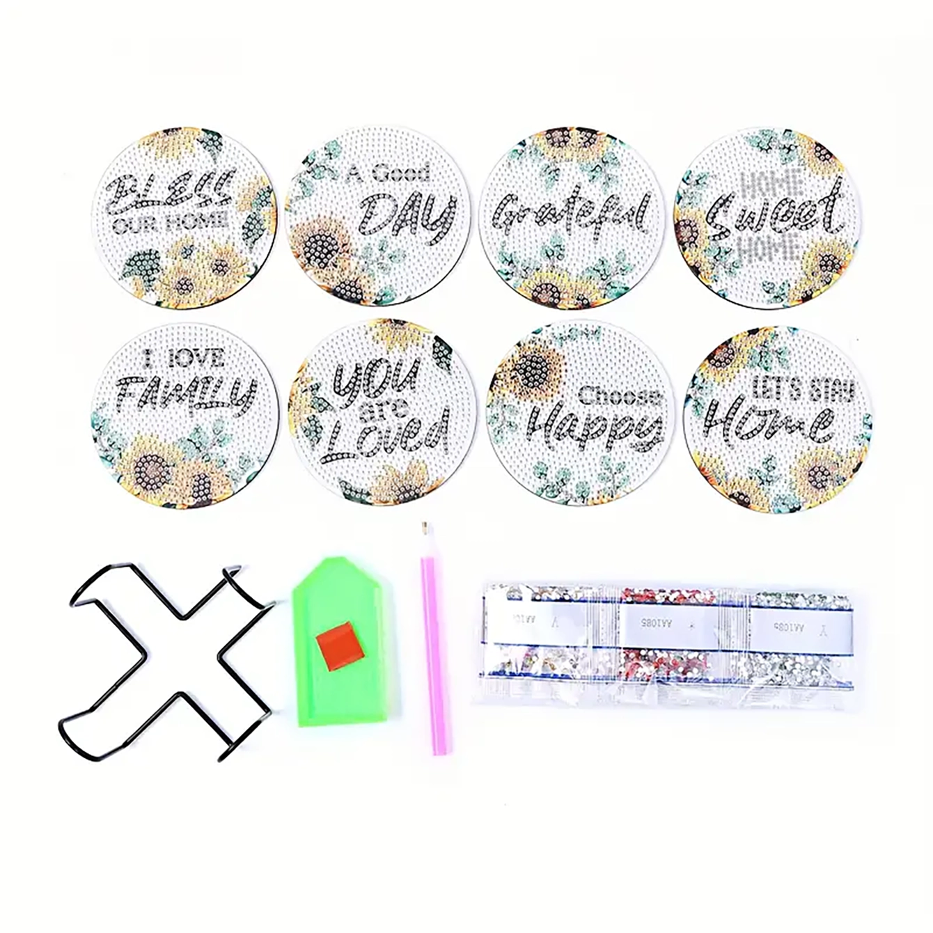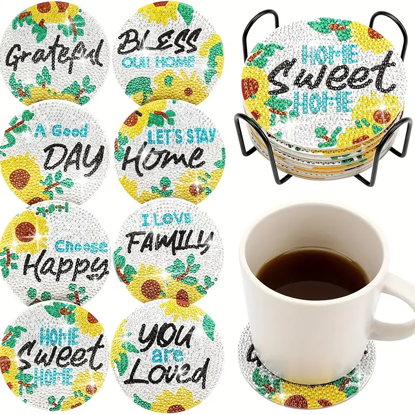 【Package Includes】Artificial Diamond Painting Coaster x 8, Coaster Holder x 1, Clay Glue x 1, Pen x 1, Diamond Tray x 1