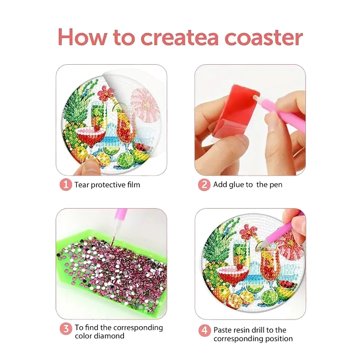【DIY Coasters】The Diamond Painting Kit has all the tools needed to make it easy for you to finish the piece. First rip the protective film of the coaster, then find the corresponding diamond dots according to the printed numbers or letters, and embellish them, and finally put the cork pad on the coaster, and you are finished.