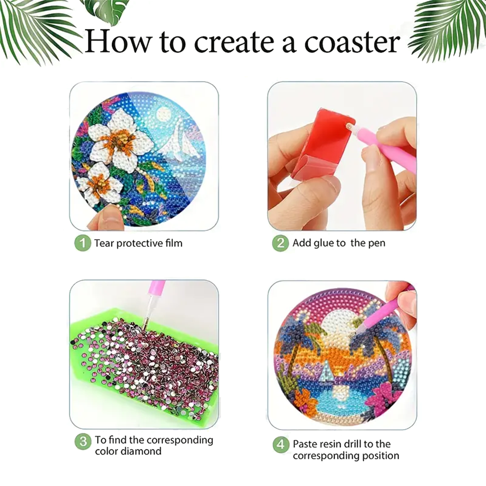 【DIY Coasters】The Diamond Painting Kit has all the tools needed to make it easy for you to finish the piece. First rip the protective film of the coaster, then find the corresponding diamond dots according to the printed numbers or letters, and embellish them, and finally put the cork pad on the coaster, and you are finished.