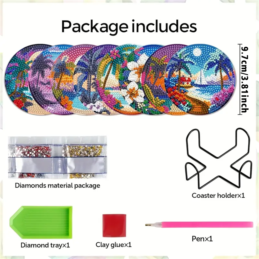 【Package Includes】Artificial Diamond Painting Coaster x 8, Coaster Holder x 1, Clay Glue x 1, Pen x 1, Diamond Tray x 1