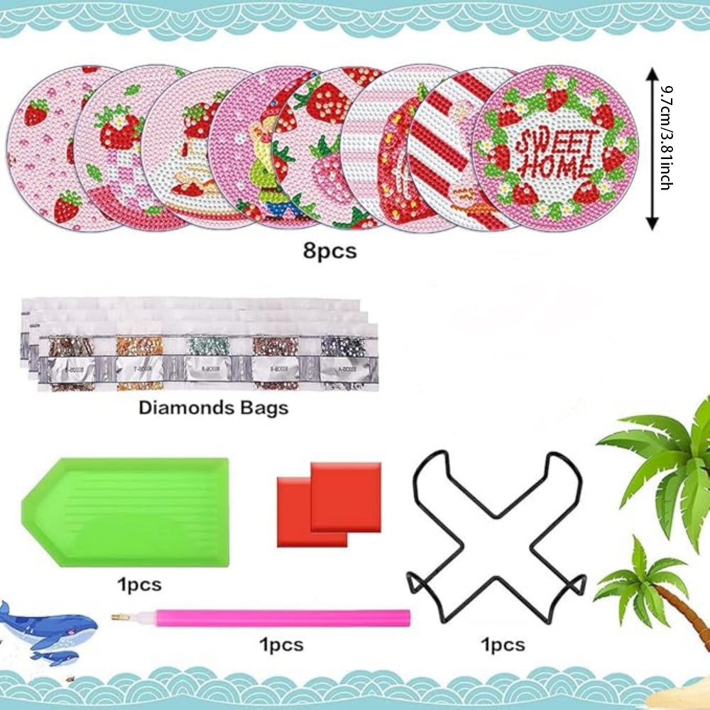 【Package Includes】Artificial Diamond Painting Coaster x 8, Coaster Holder x 1, Clay Glue x 1, Pen x 1, Diamond Tray x 1
