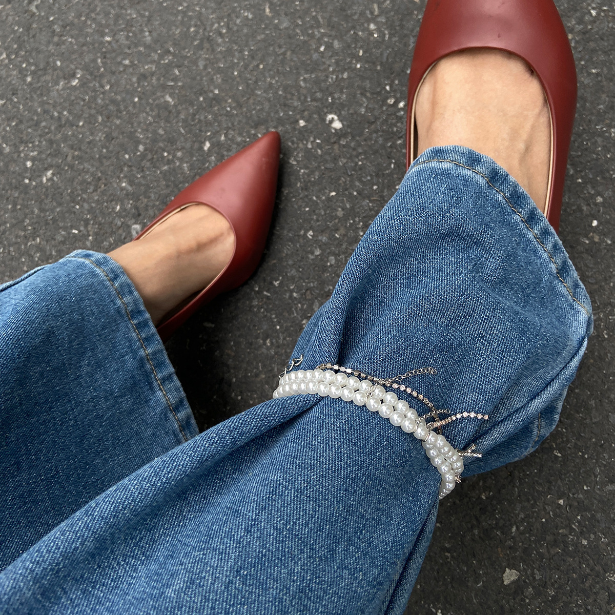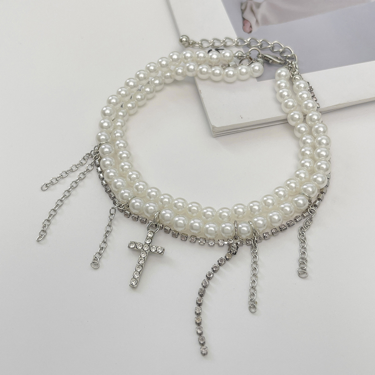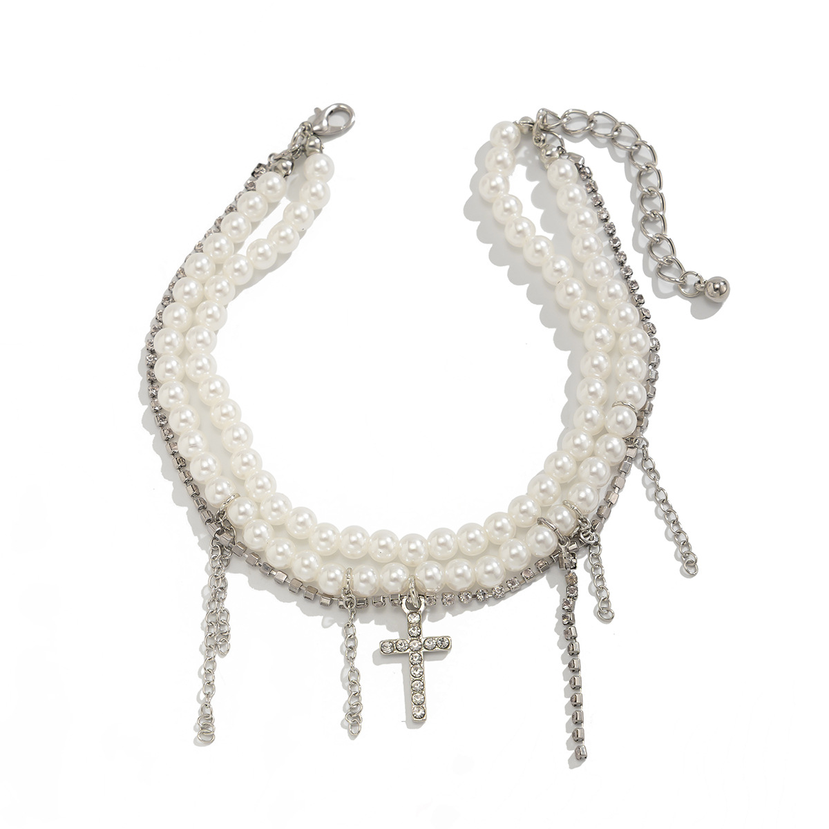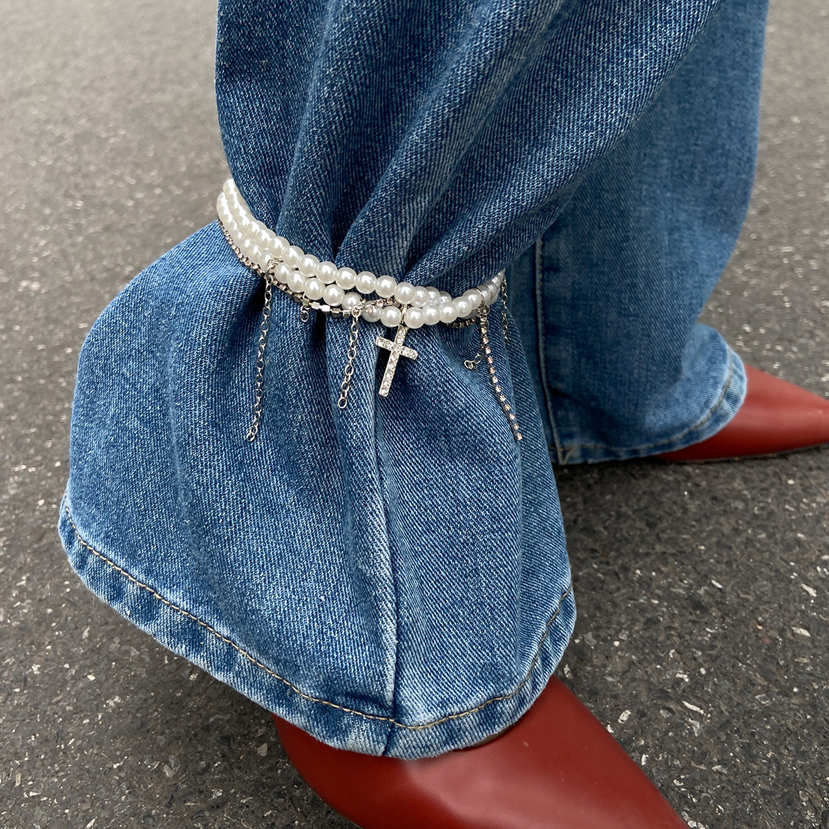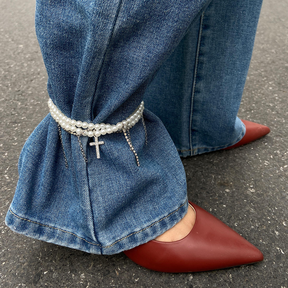 Diamond Cross Pendant Tassel Anklet Stringed Pearls Jeans Decoration
