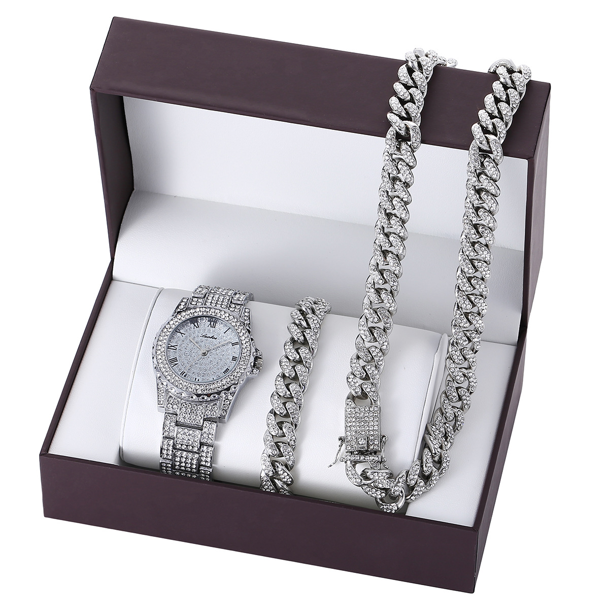 Product name: Fashion, luxury, trendy temperament, full diamond-studded steel band quartz watch + bracelet set (3pcs/set)