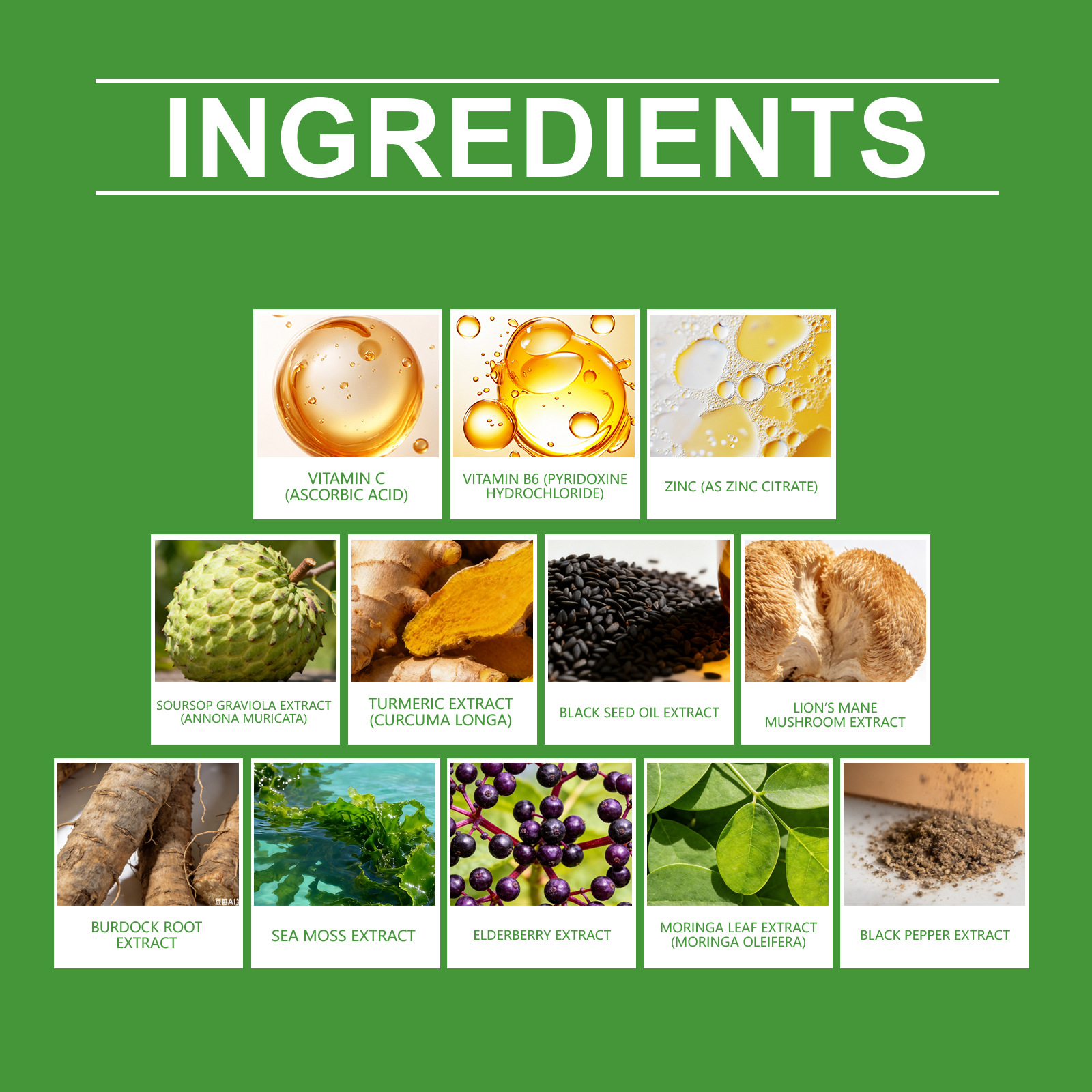 Ingredients: vitamin C (ascorbic acid), vitamin B6 (pyridoxine hydrochloride), zinc (zinc citrate), annona spinosa extract (annona), turmeric extract (turmeric), nigella seed oil extract, Hericium erinaceus extract, burdock root extract, seaweed extract, Sambucus williamsii extract, Moringa leaf extract (Moringa oleifera extract), and black pepper extract.