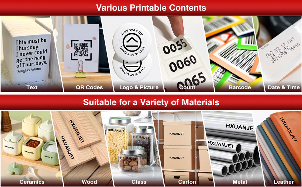 Inkjet content: Text symbol, QR code, barcode, picture, date, serial number, etc.