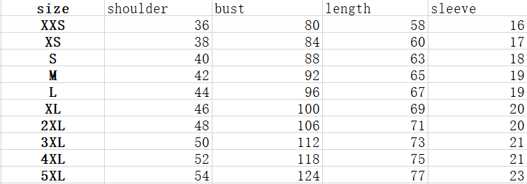 Size: XXS, XS, S, M, L, XL, XXL, XXXL, XXXXL, 5XL