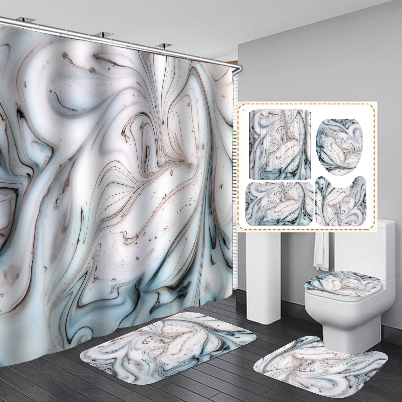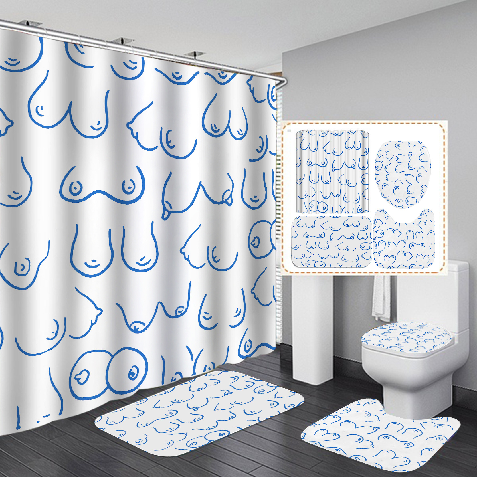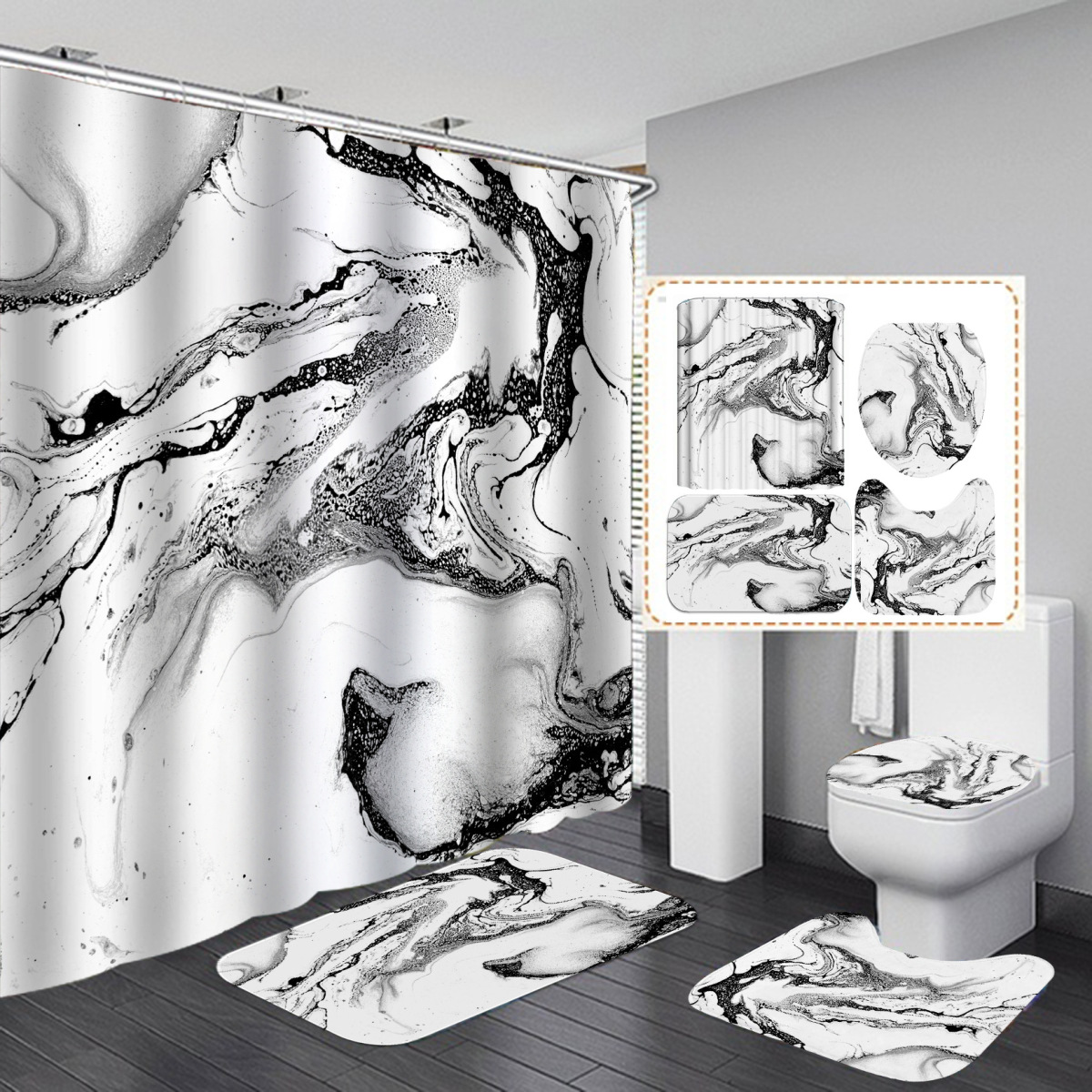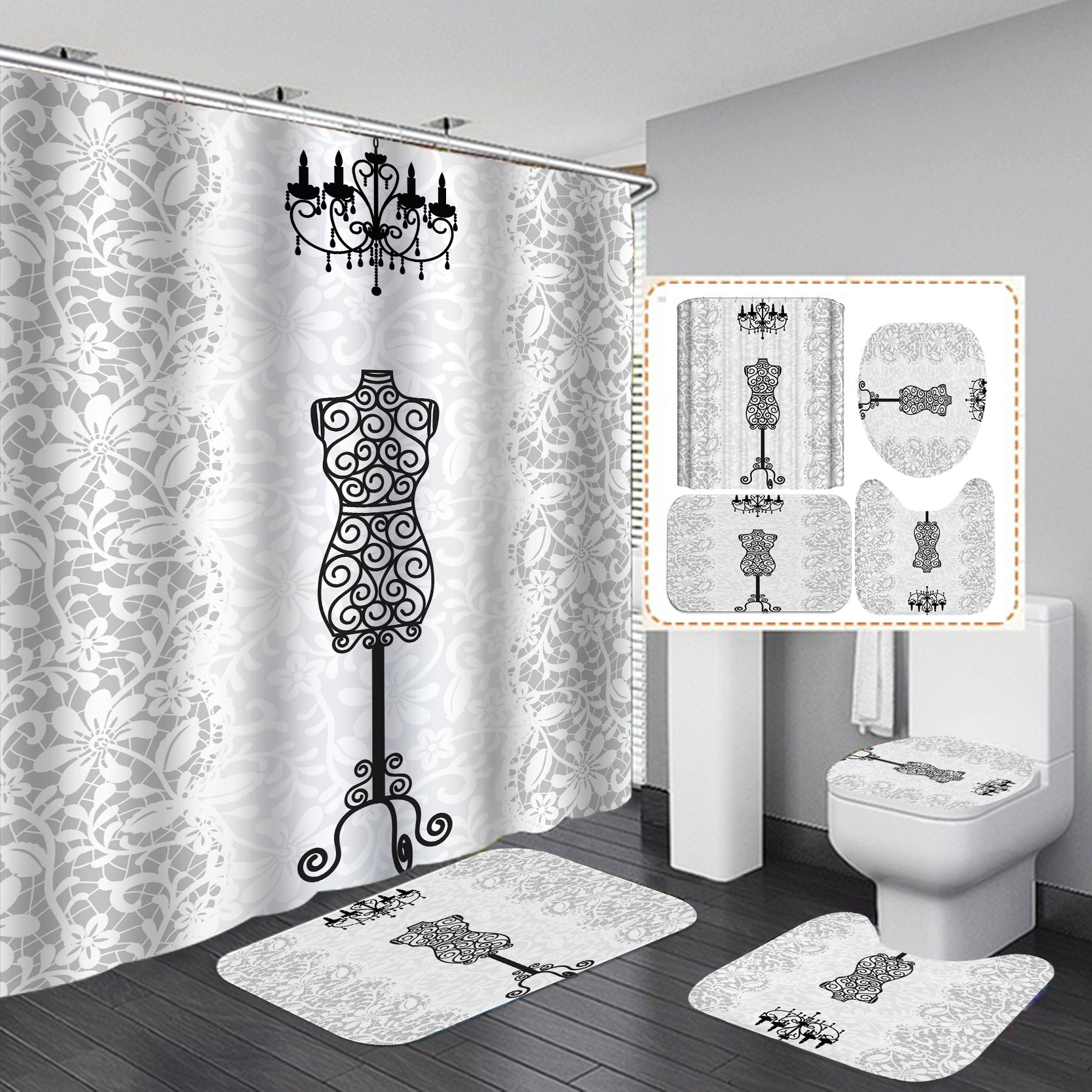 Such as 180X180 4pcs set: toilet seat + u-shaped mat + floor mat + 180X180 shower curtain