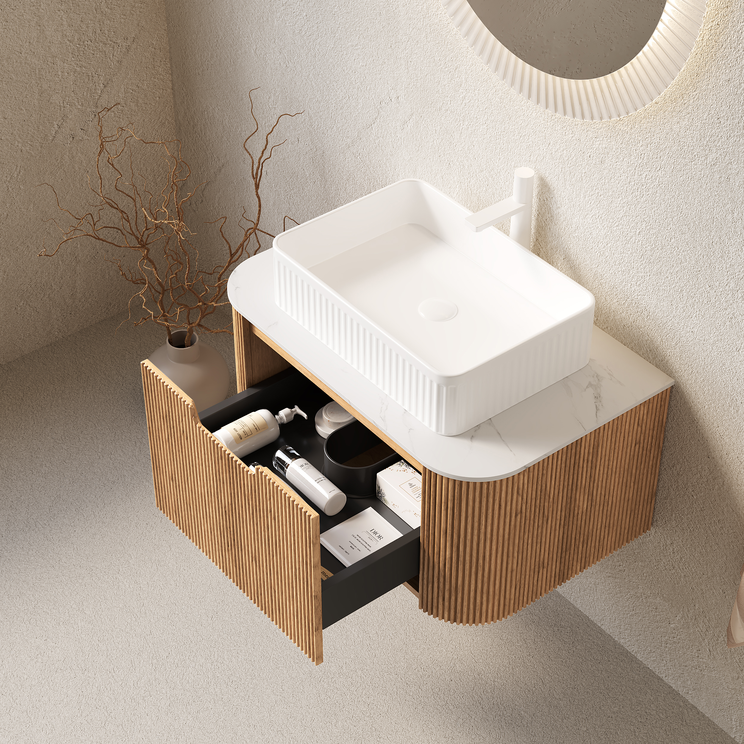 Product Name:DINA 30" Bathroom Vanity with Sink, Wall-Mounted Floating Curved Edges Striped Bathroom Storage Cabinet with Drawer, White Rectangular Ceramic Basin, No Faucet, Pre-assembled, Natural Woodgrain Color